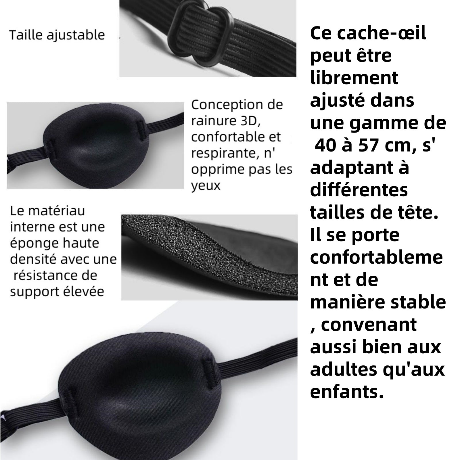 1. Réglable : Ce cache-œil peut être librement ajusté dans une gamme de 40 à 57 cm, s'adaptant à différentes tailles de tête. Il se porte confortablement et de manière stable, convenant aussi bien aux adultes qu'aux enfants.