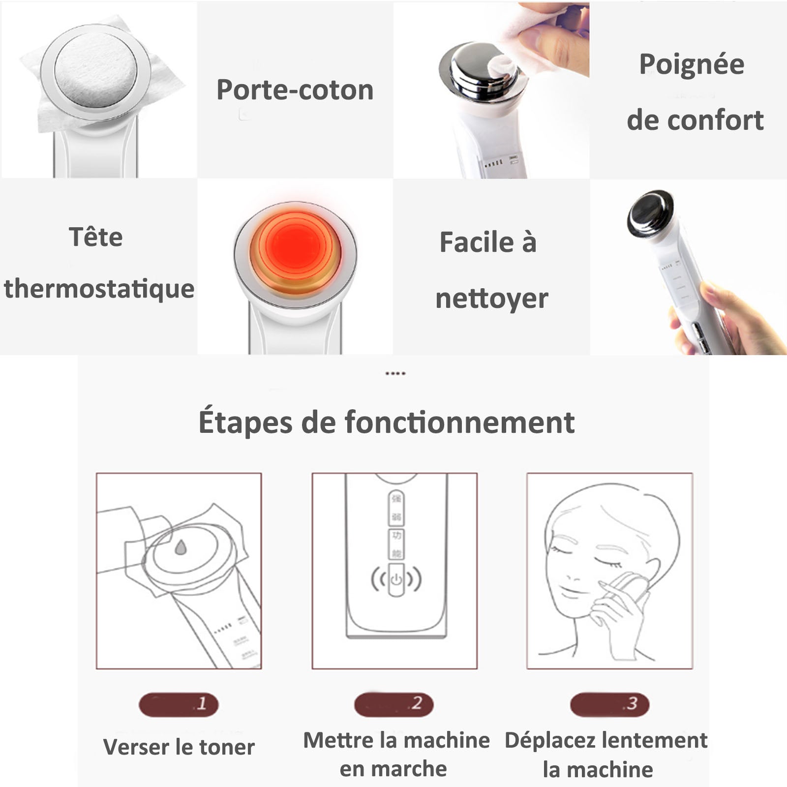 4. Expérience de massage multifonctionnelle : cet instrument de beauté a un style de massage, qui peut offrir aux utilisateurs une expérience de massage facial confortable, aider à détendre la peau, favoriser la circulation sanguine, améliorer l'élasticité de la peau et peut également introduire l'essence du masque facial dans la peau profonde.