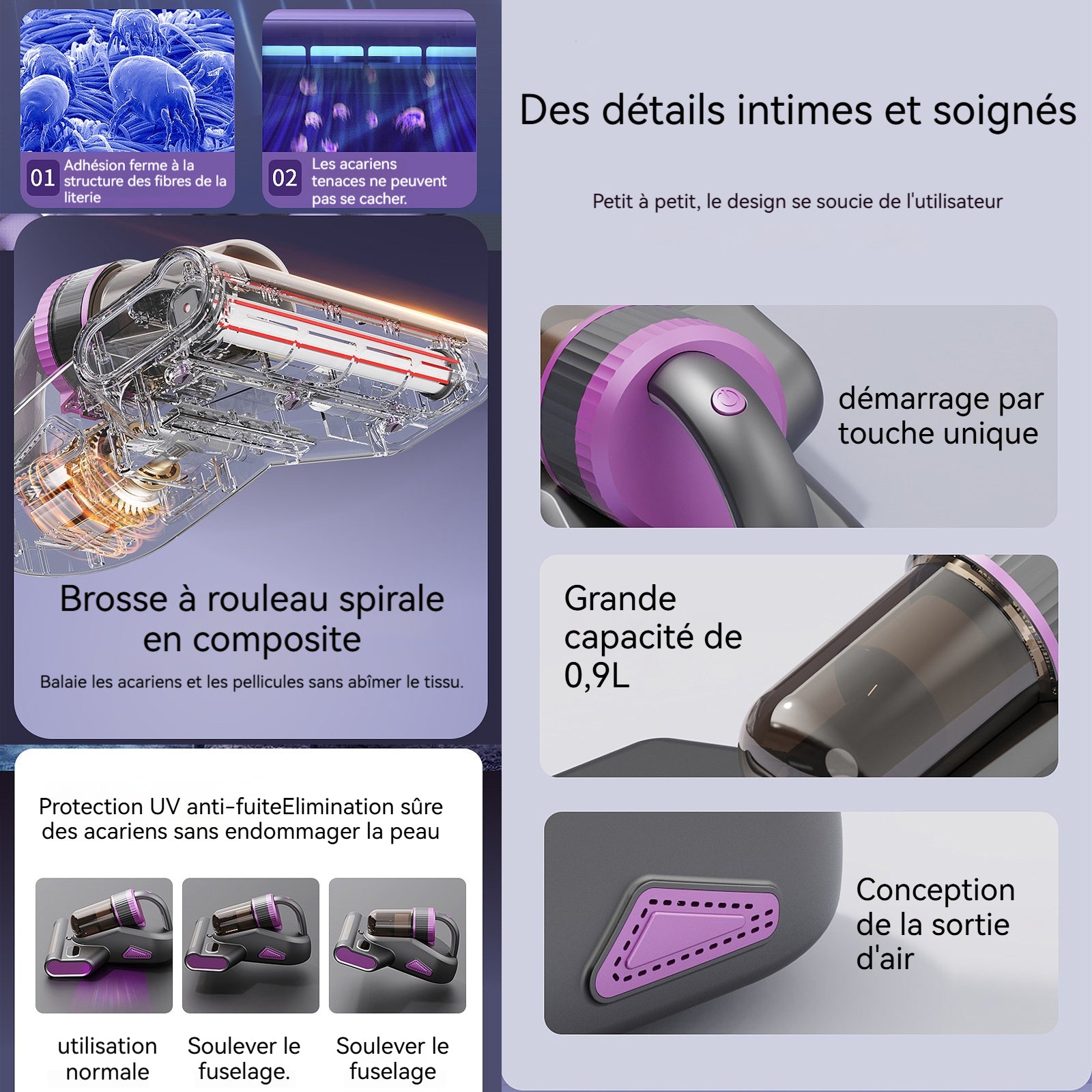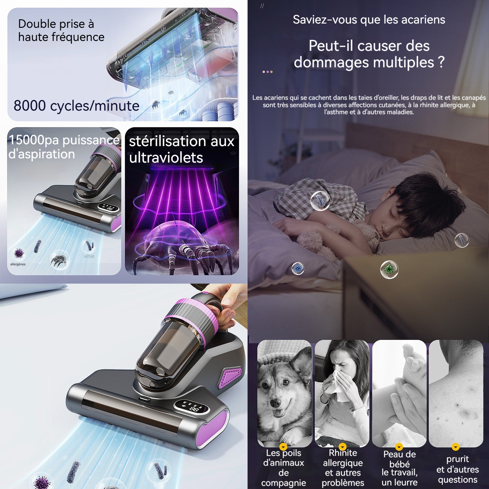 4. Puissance d'aspiration élevée : Cet aspirateur possède une puissance d'aspiration de 15000Pa, permettant d'éliminer efficacement les acariens ainsi que leurs excréments et leurs aliments.