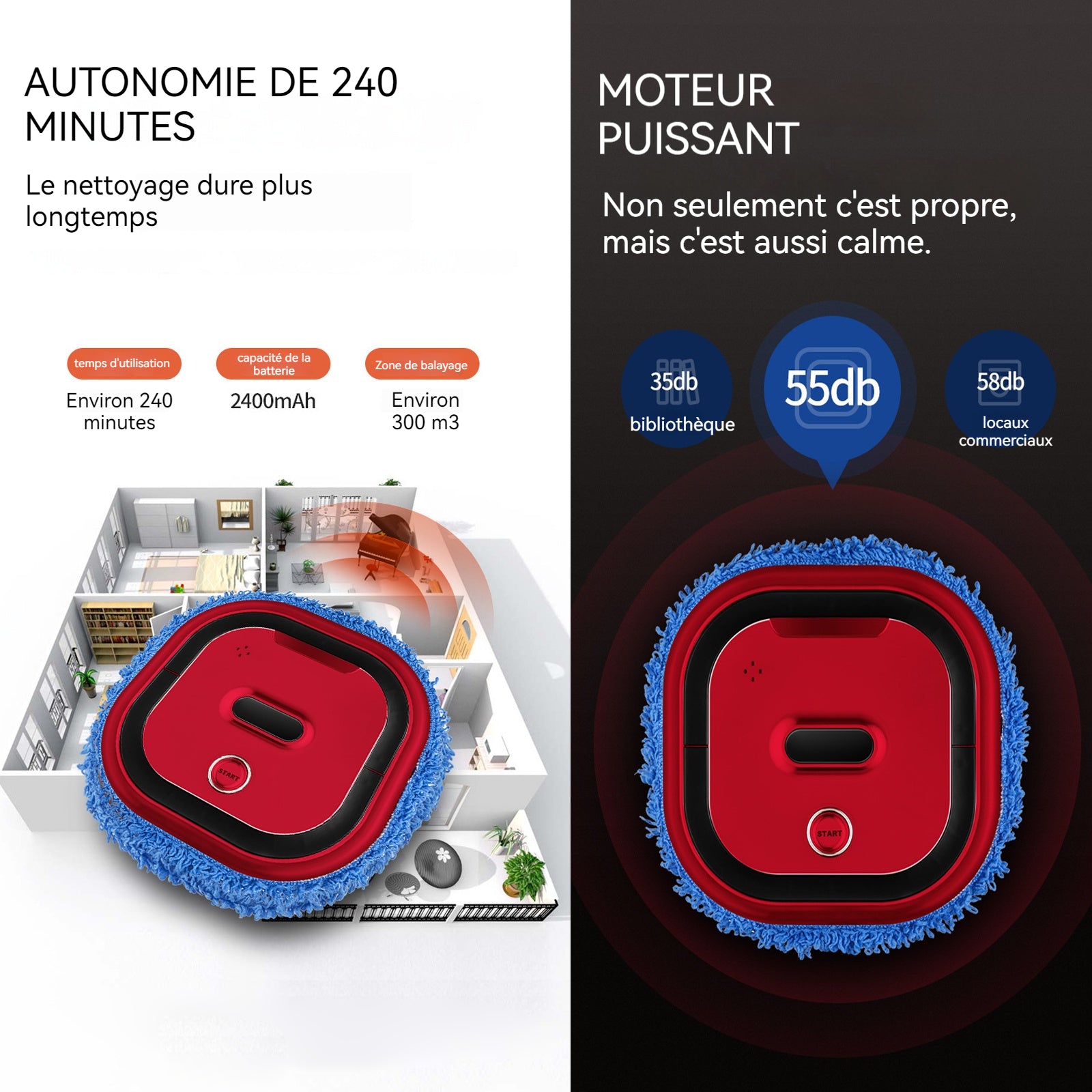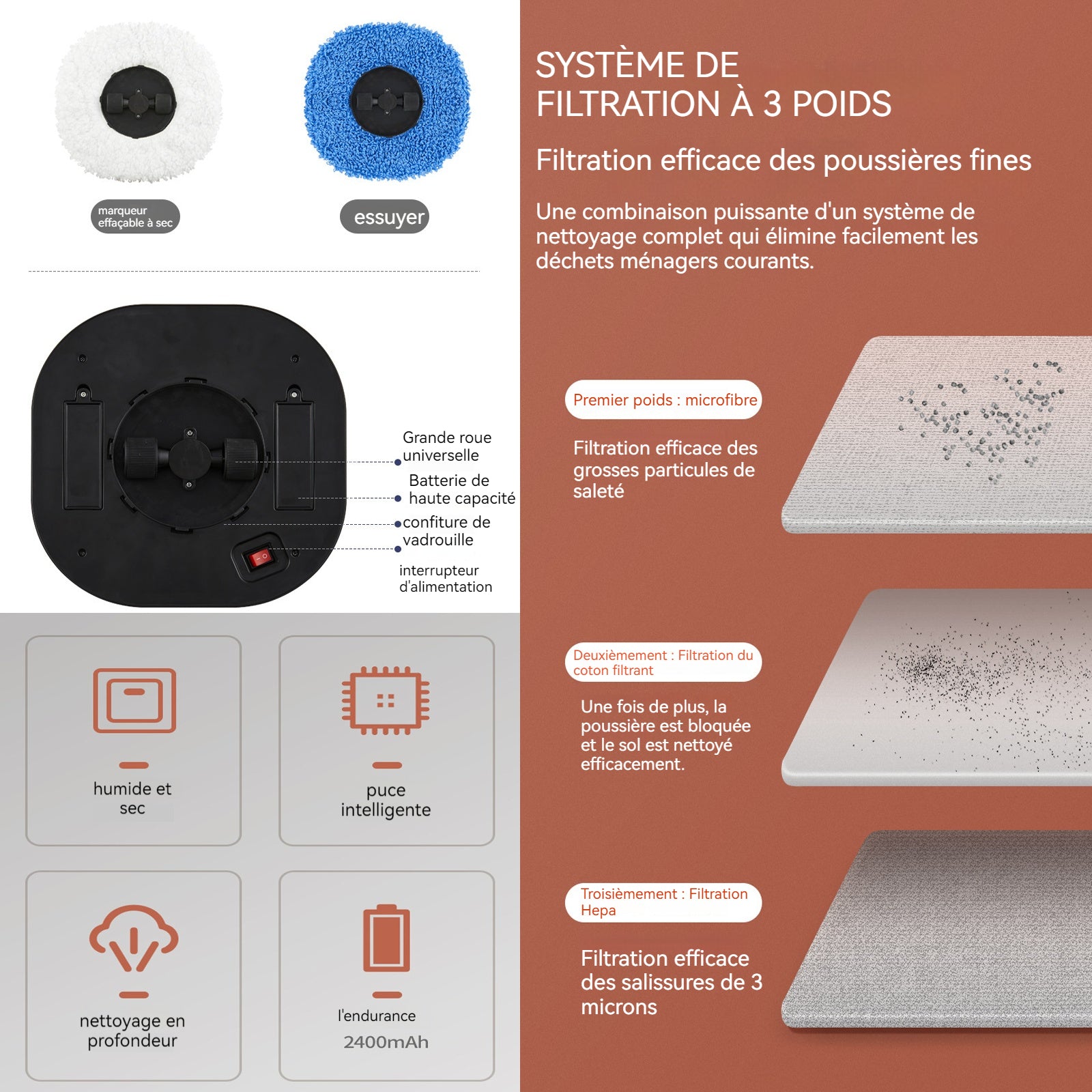 2. Autonomie ultra longue : Ce robot nettoyeur de sol est équipé d'une batterie de grande capacité de 2400 mAh, garantissant une forte capacité d'autonomie. Chaque charge complète permet une utilisation de plus de 2 heures, avec une surface maximale de nettoyage allant jusqu'à 300 mètres carrés, offrant une expérience de nettoyage efficace et complète.