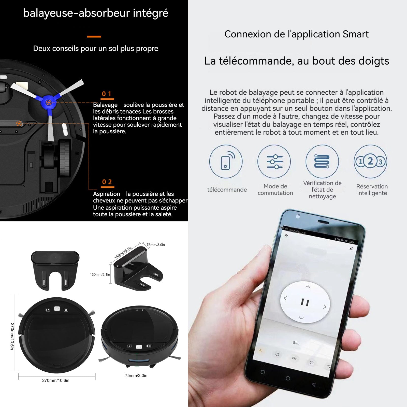 Robot aspirateur 3 en 1 forte puissance d'aspiration 3000Pa utilisation humide/sèche Nettoyage de 120 mètres carrés à la fois