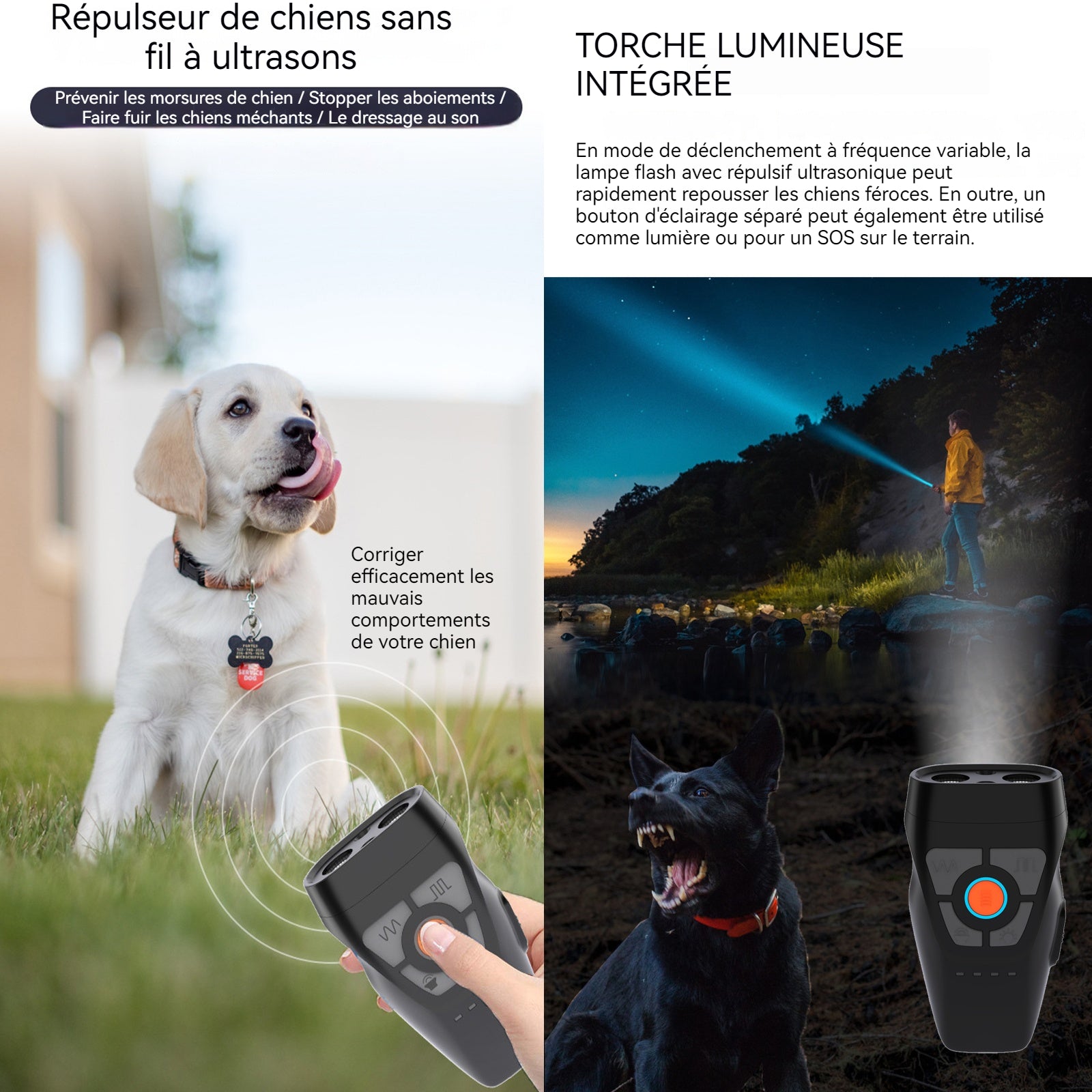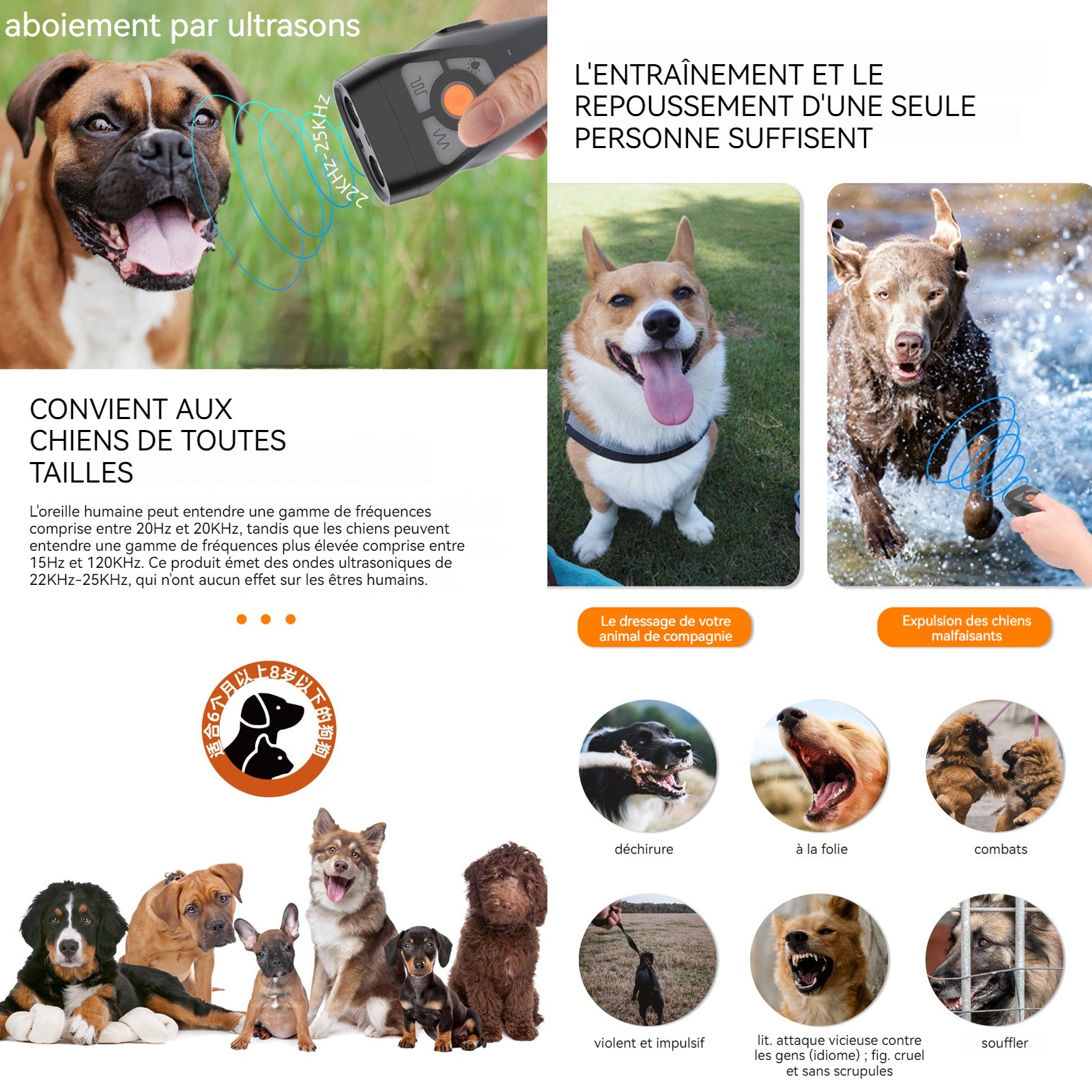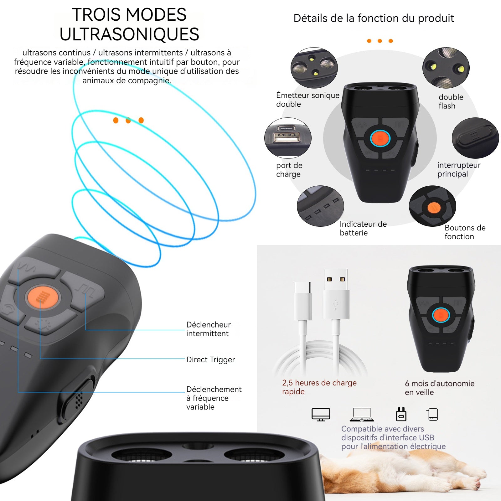 Anti aboiement chien 2000mAh 25khz répulsif à ultrasons pour chiens à double tête avec 3 modes ultrasoniques et lampe de poche