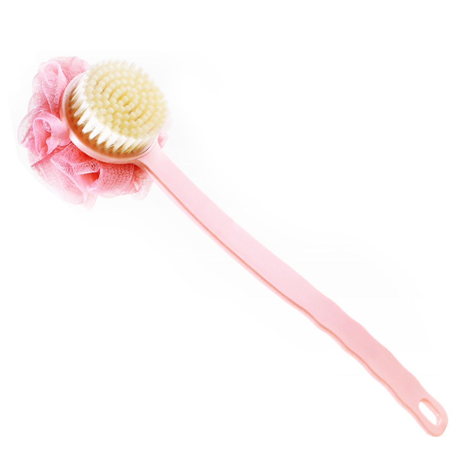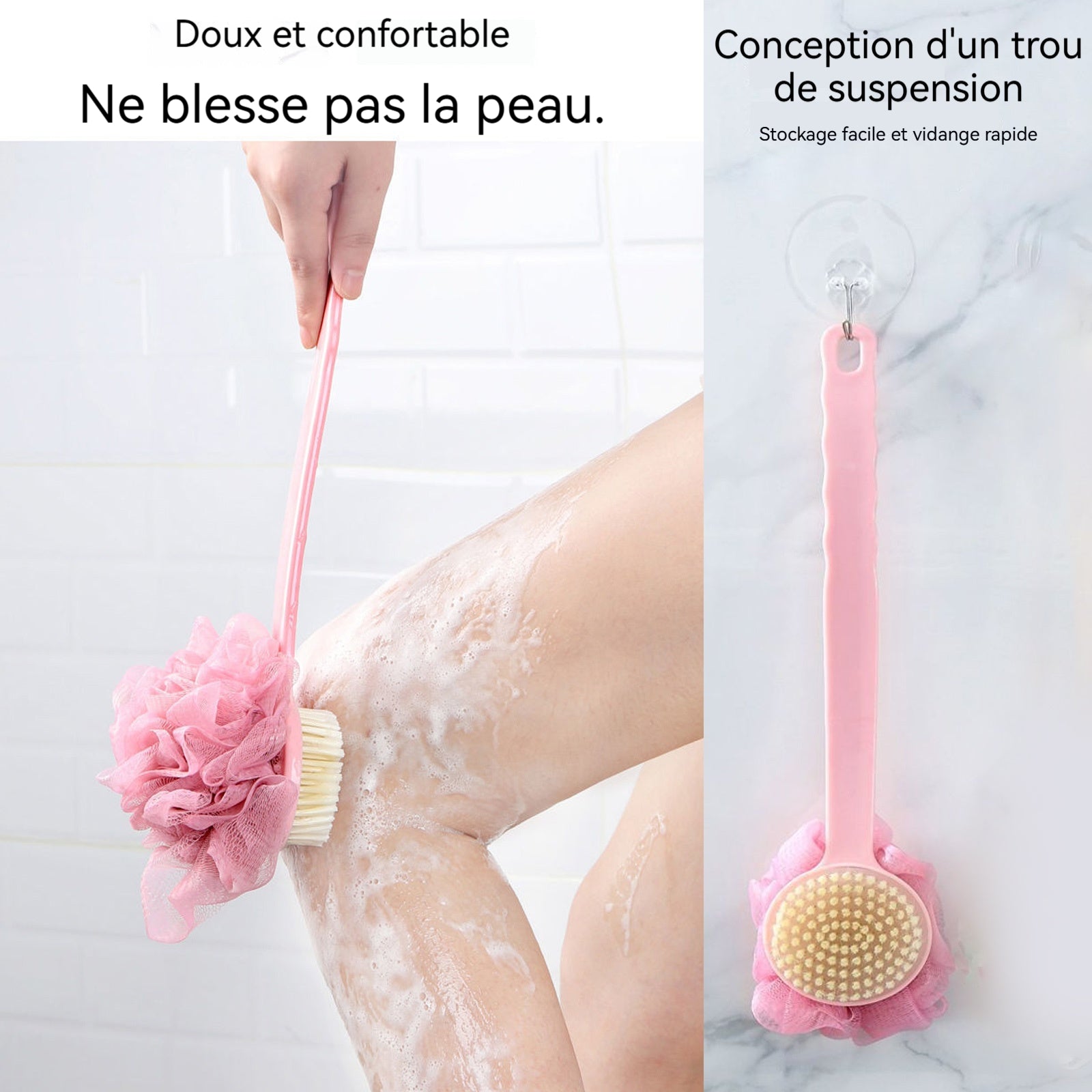 4. Design à long manche : Ce produit est spécialement conçu avec un long manche qui vous permet de nettoyer facilement toutes les parties du corps, comme le dos et les jambes. Le manche est également équipé d'une corde de suspension pour un rangement pratique.