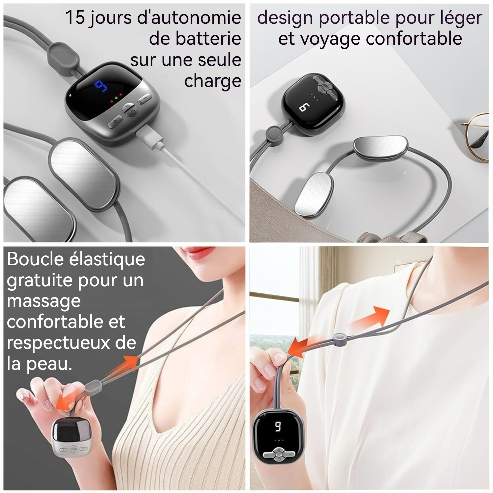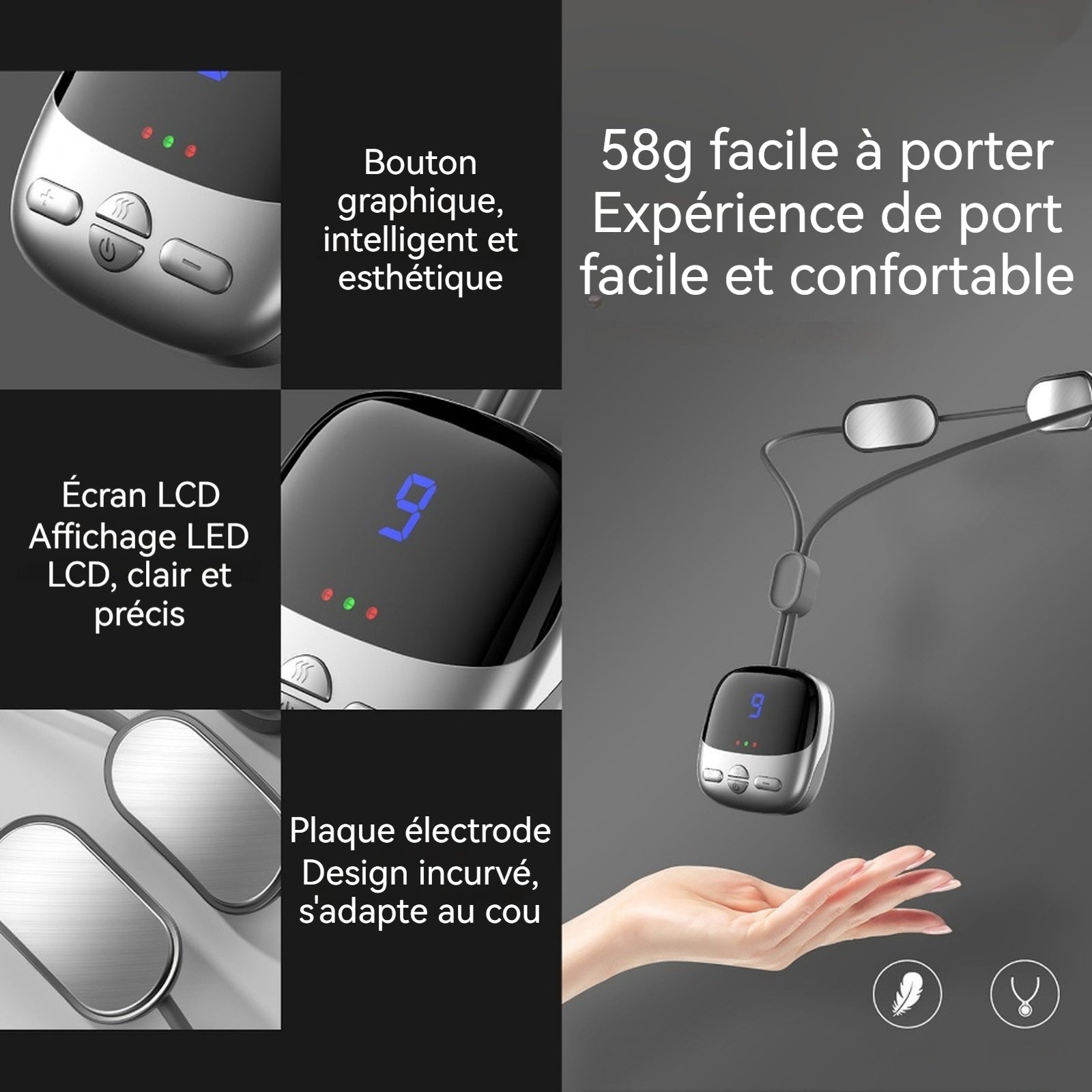 2. Expérience de portabilité optimale : Le masseur pour le cou pèse seulement 58g, avec un design en pendentif, et un anneau ajustable pour un maintien parfait autour de la nuque. Il peut être porté sans effort, permettant de profiter d'un massage même en déplacement.