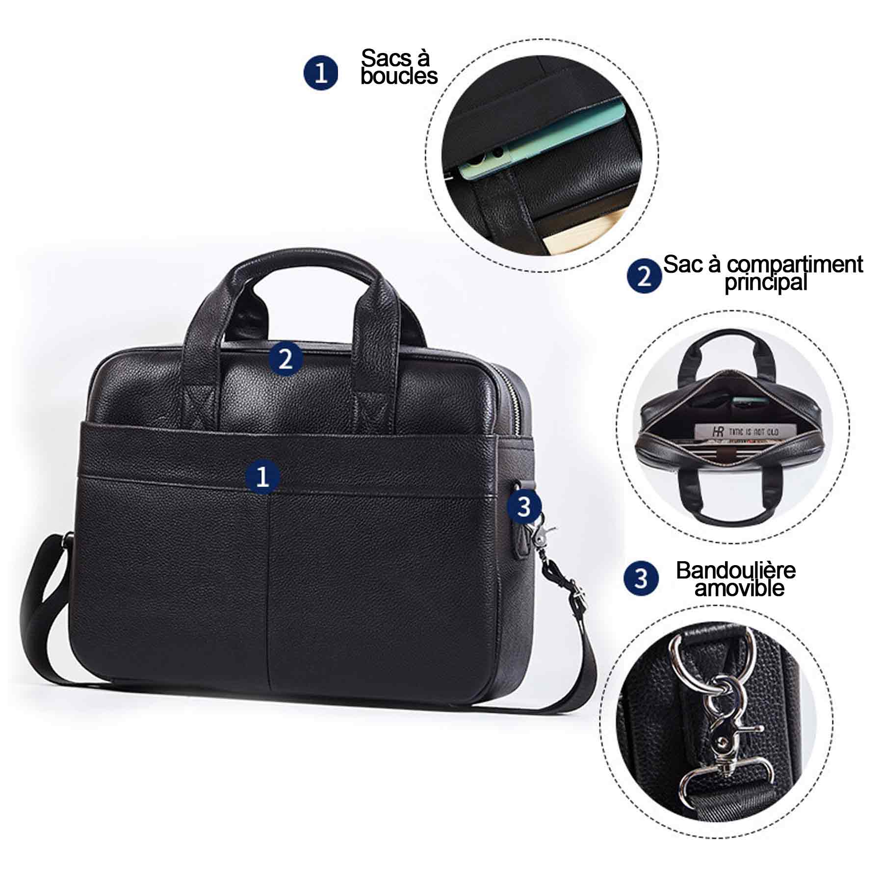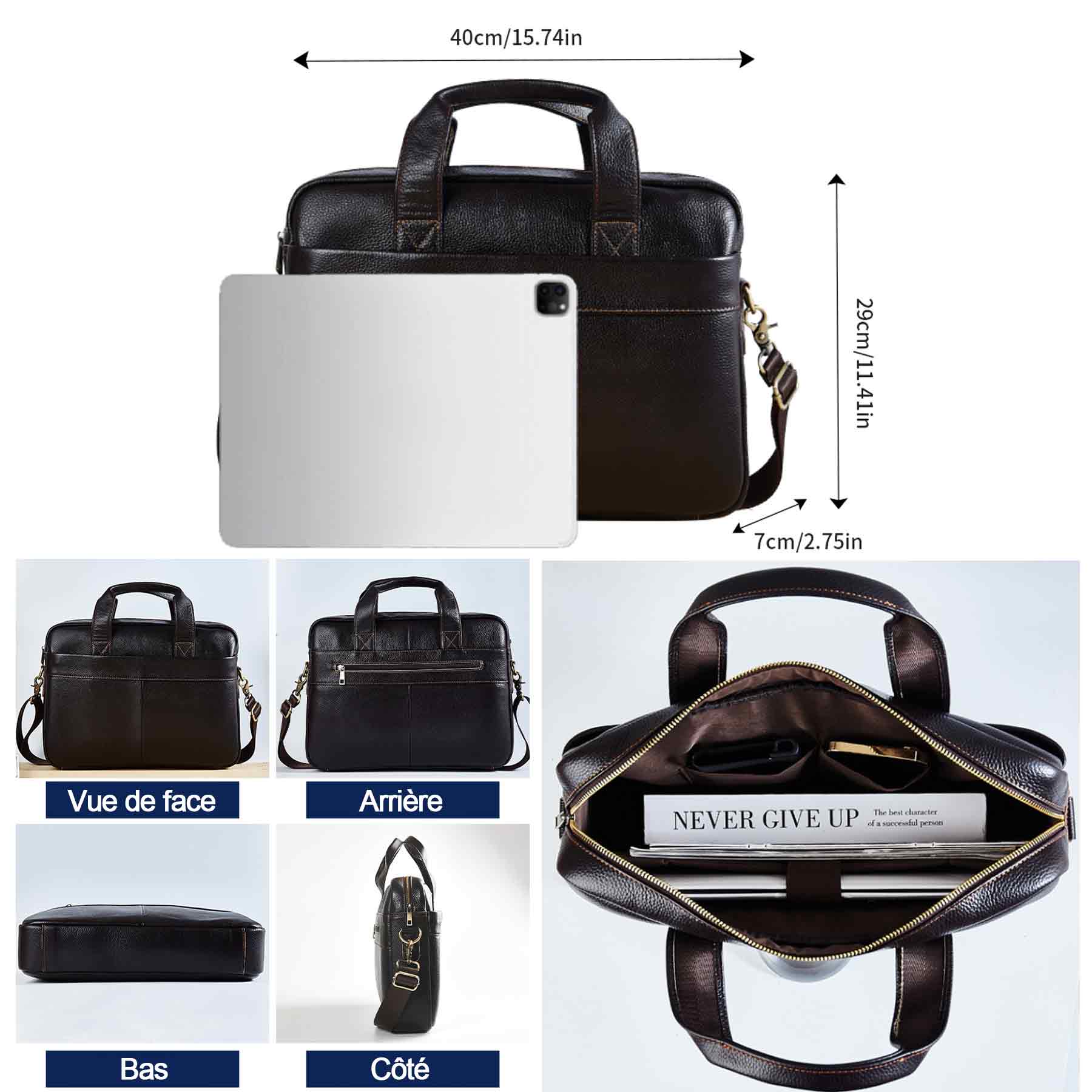 Sacoche homme 40 x 29 x 7 cm première couche de cuir de vachette convient aux voyages d'affaires ou aux déplacements quotidiens