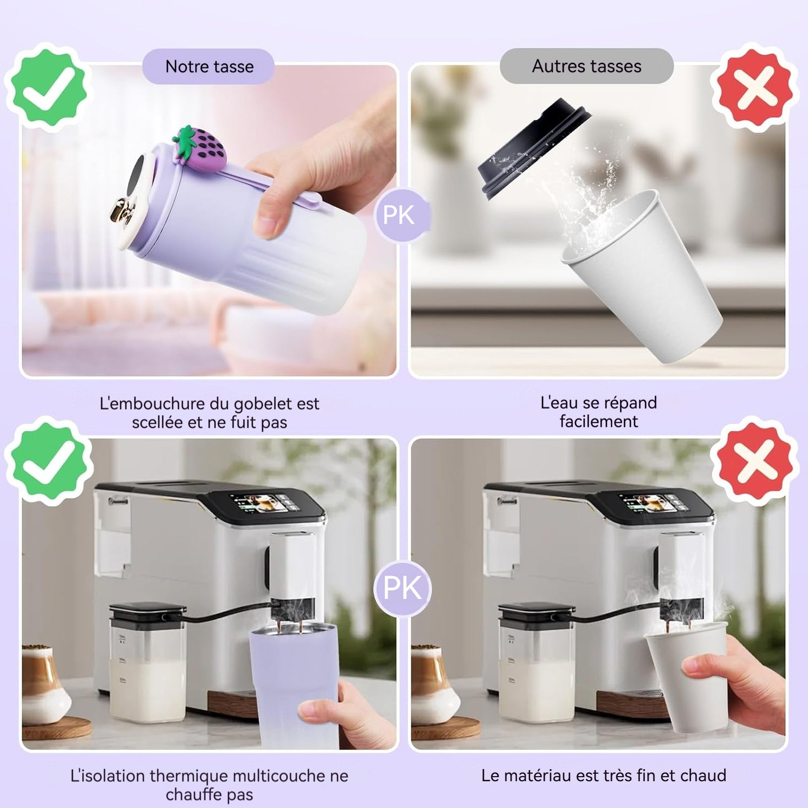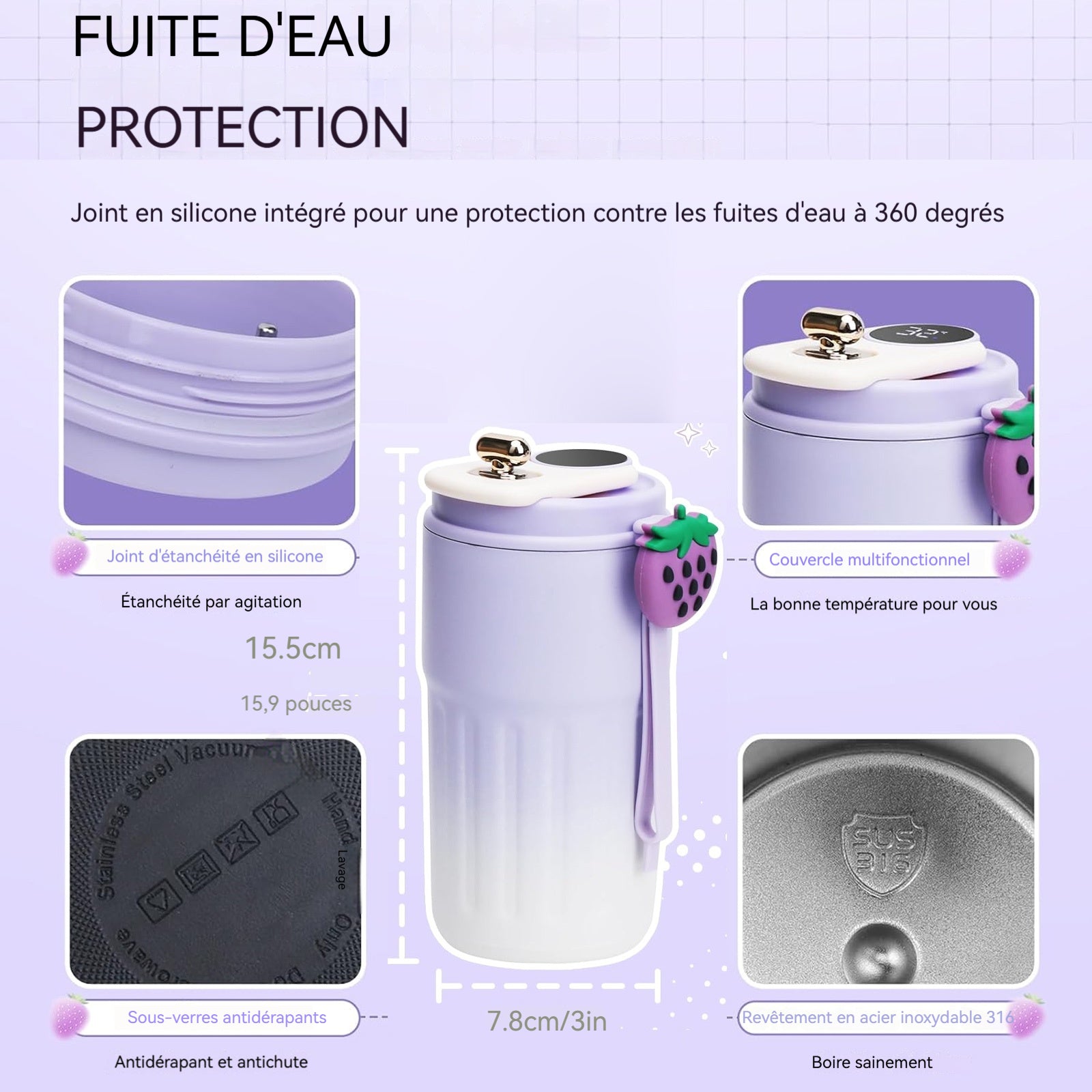4. Joint étanche : grâce à la conception du joint sécurisé, vous pouvez profiter de vos boissons à tout moment et n'importe où sans vous soucier des déversements ou des fuites.
