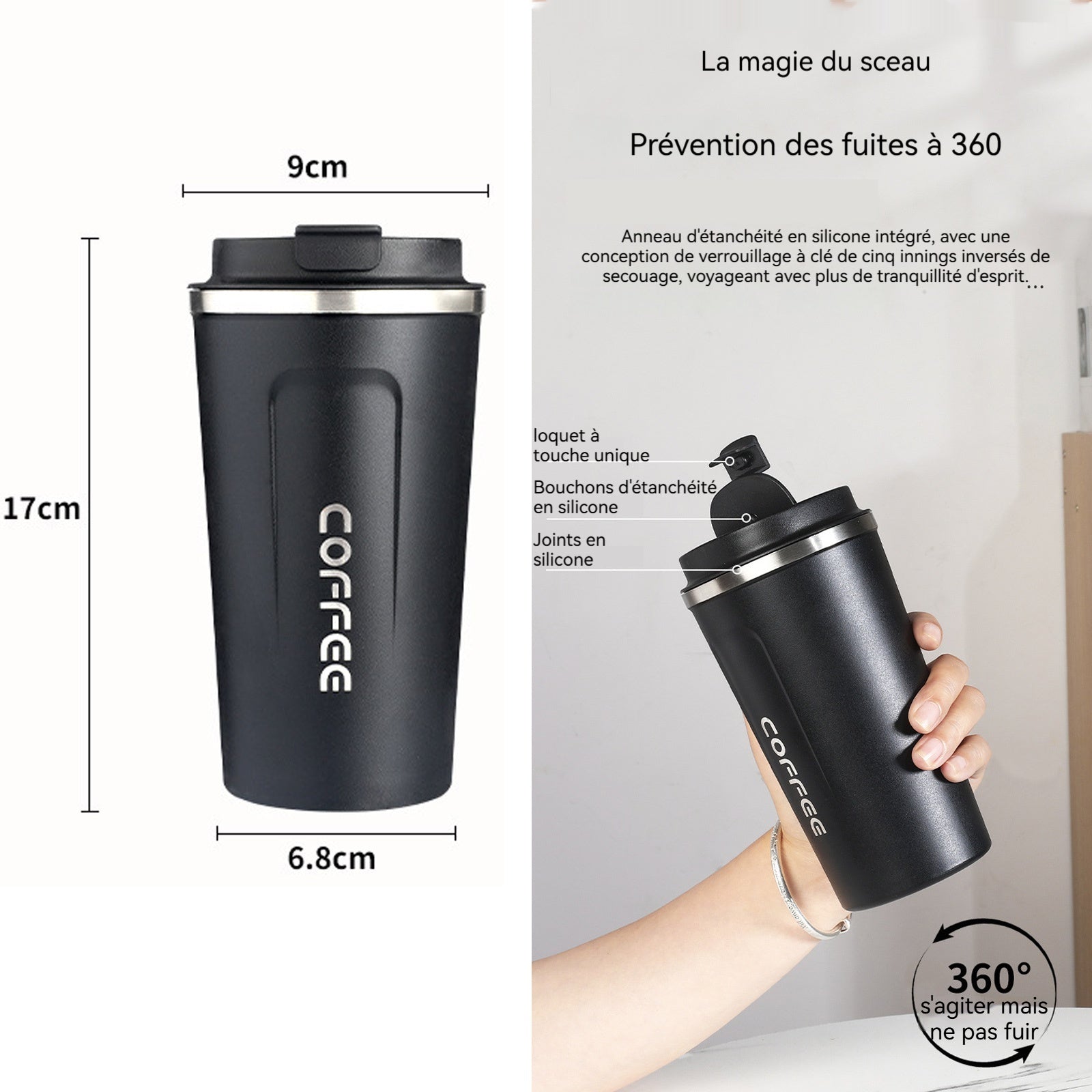 4. Étanchéité et anti-fuites : Le mug à café est équipé d'un joint en silicone hermétique et d'un design de verrouillage à un bouton, assurant une protection anti-fuites à 360 degrés. Même en étant renversé ou secoué, il ne fuit pas, offrant une plus grande tranquillité d'esprit lors des déplacements.