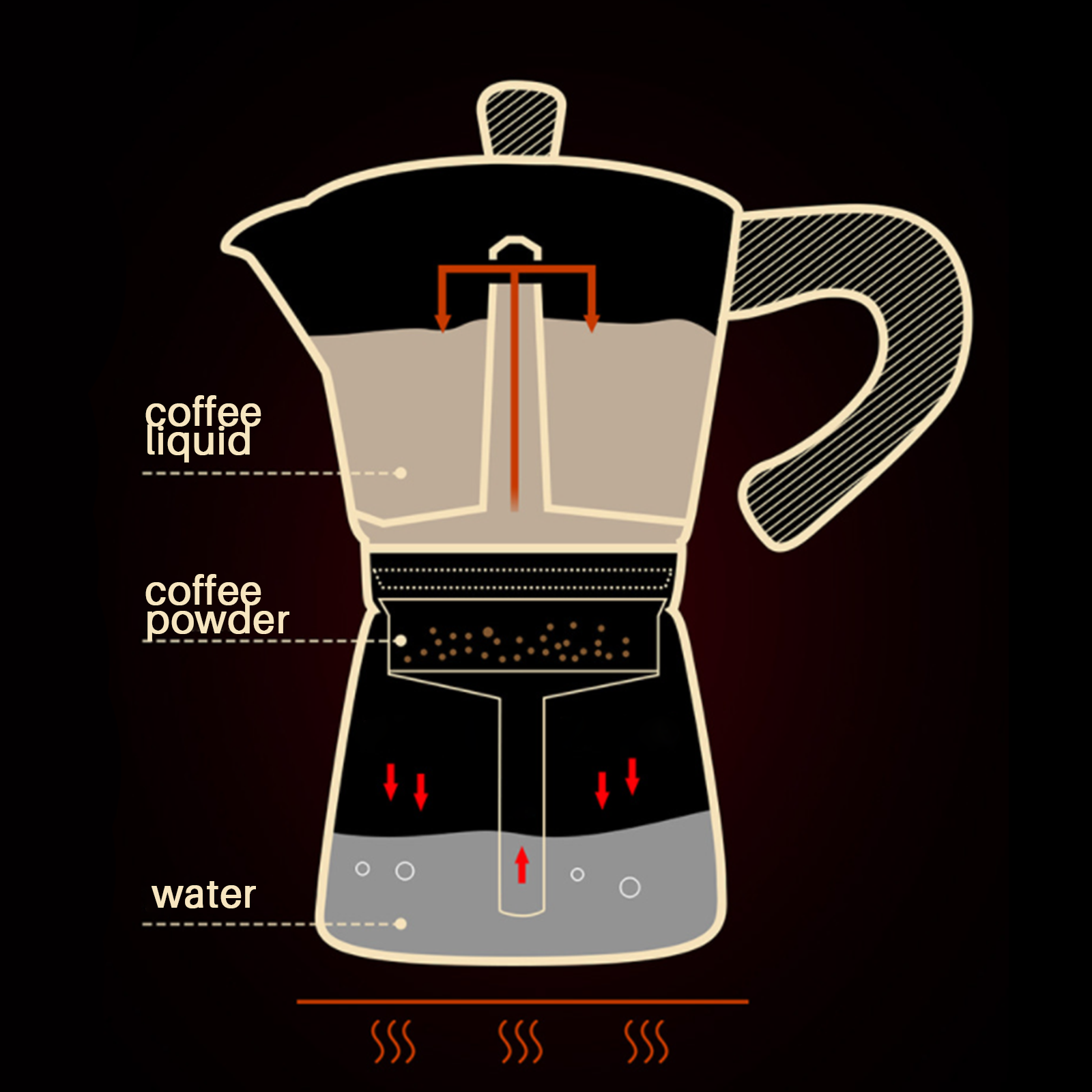 ✅ [Principe de fonctionnement] : le pot moka consiste à chauffer l'eau dans le pot inférieur en vapeur et à utiliser la pression de la vapeur pour pousser l'eau vers le conduit dans le réservoir à poudre et extraire le café liquide, puis continuer à pousser. à travers le conduit jusqu'au pot supérieur pour s'écouler.