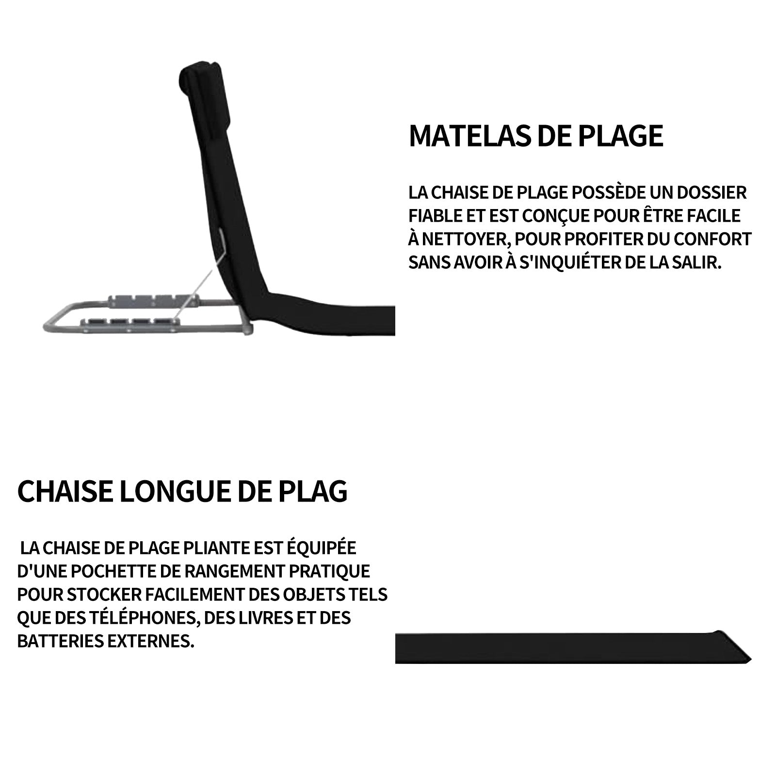 3. Rangement pratique : La chaise de plage pliante est équipée d'une pochette de rangement pratique pour stocker facilement des objets tels que des téléphones, des livres et des batteries externes.