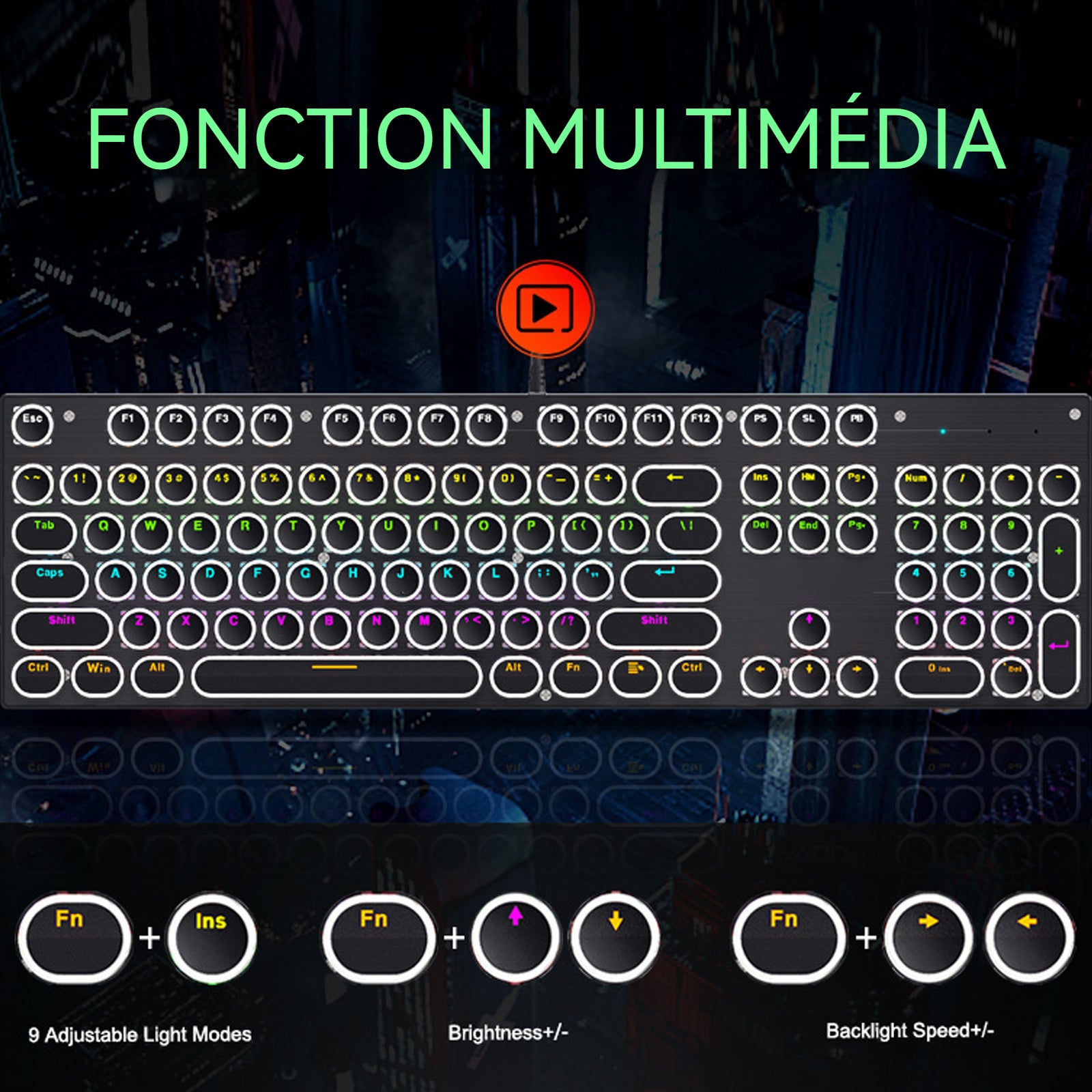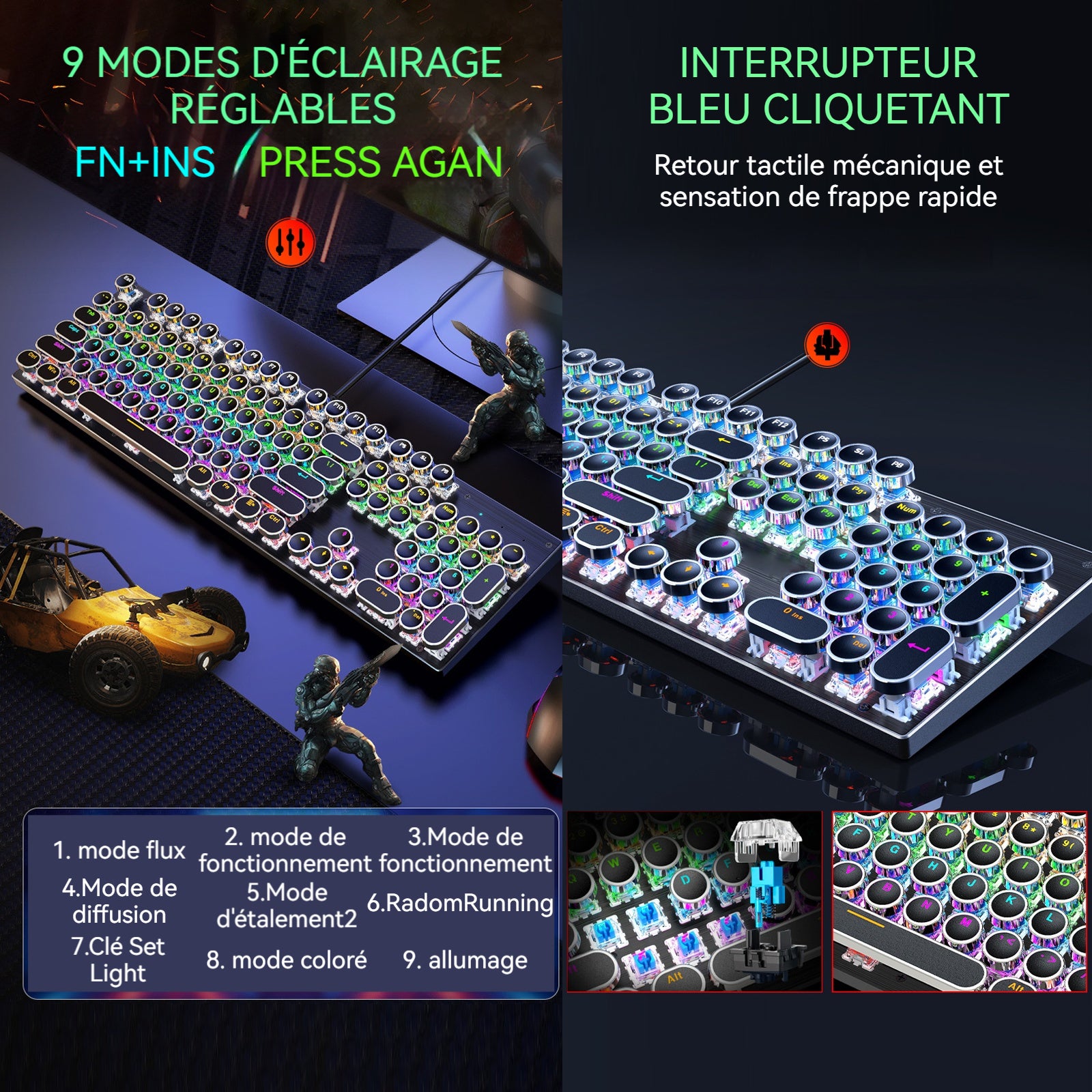 3. Rétroéclairage RGB : Ce clavier mécanique prend en charge plusieurs modes d'effets lumineux RGB, permettant de personnaliser les couleurs et les effets dynamiques, ce qui renforce l'immersion dans le jeu.