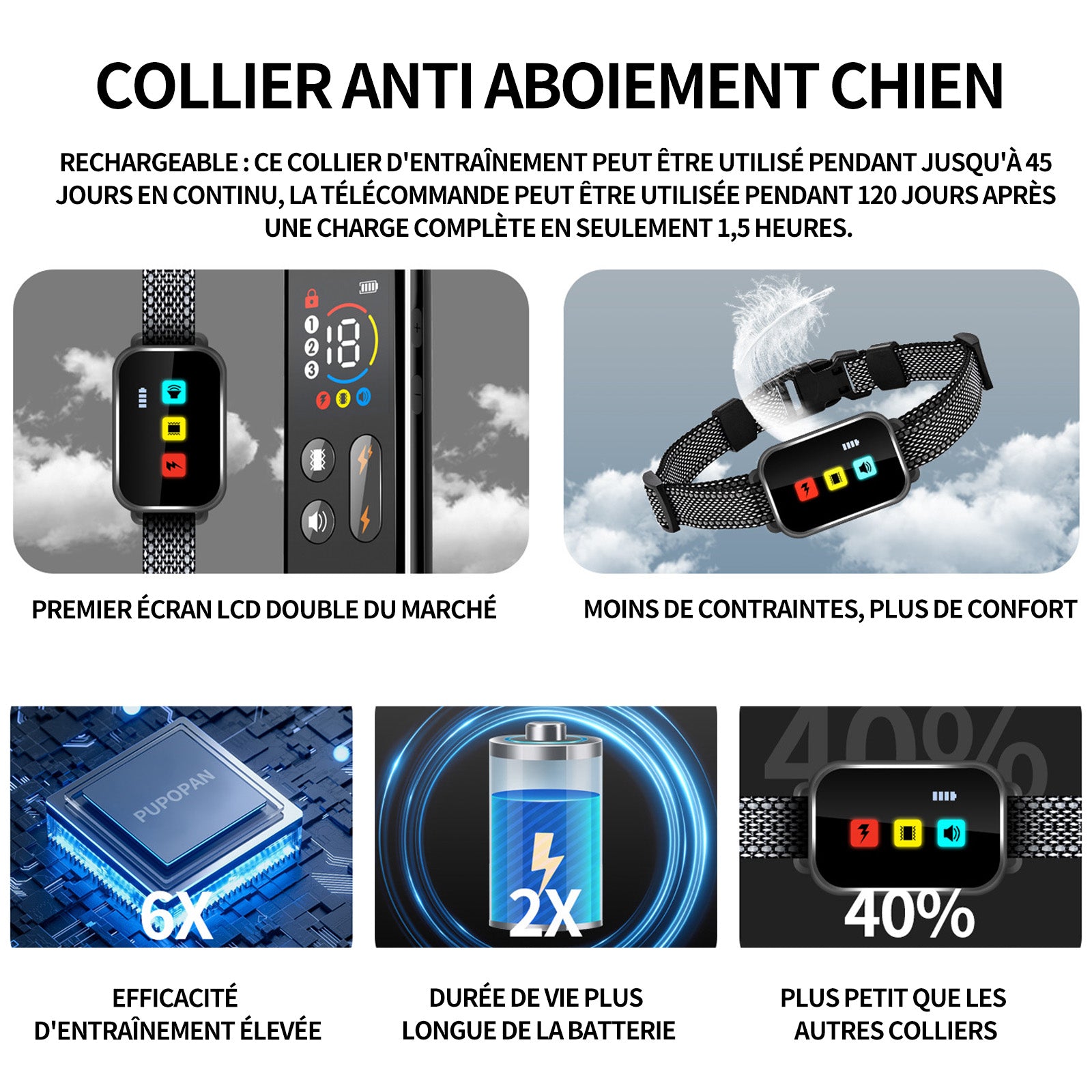 3. Rechargeable : Ce collier d'entraînement peut être utilisé pendant jusqu'à 45 jours en continu, la télécommande peut être utilisée pendant 120 jours après une charge complète en seulement 1,5 heures.