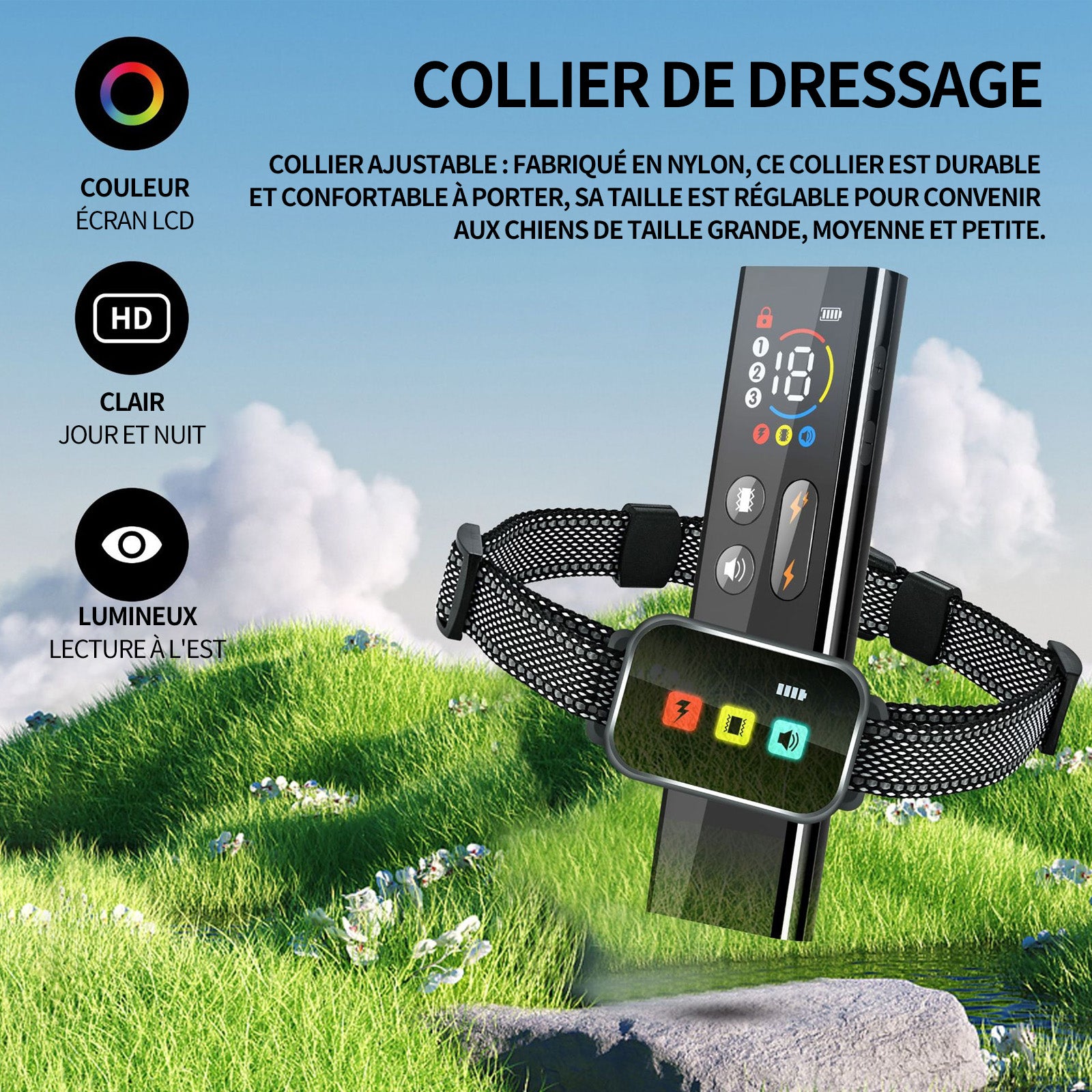 4. Collier ajustable : Fabriqué en nylon, ce collier est durable et confortable à porter, sa taille est réglable pour convenir aux chiens de taille grande, moyenne et petite.