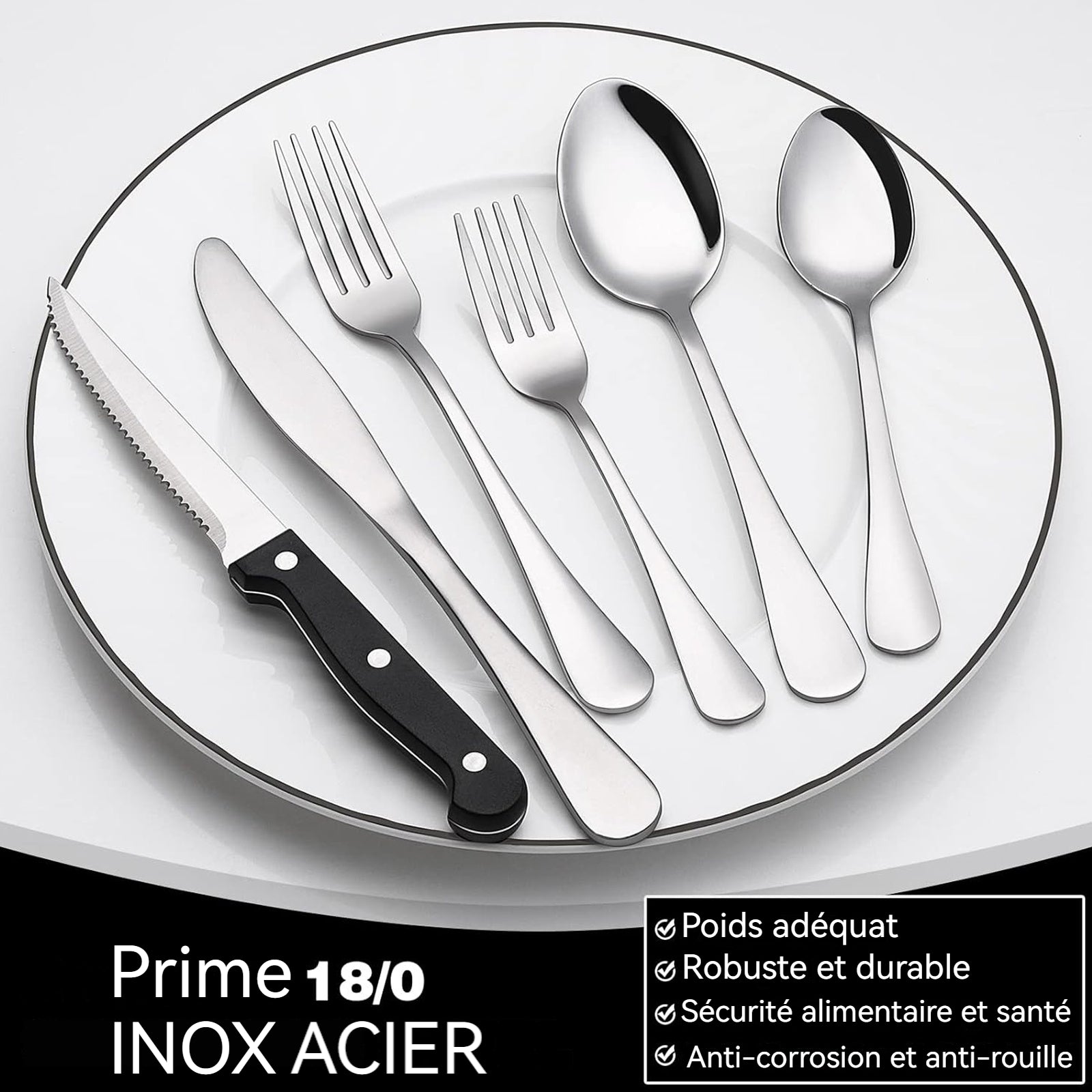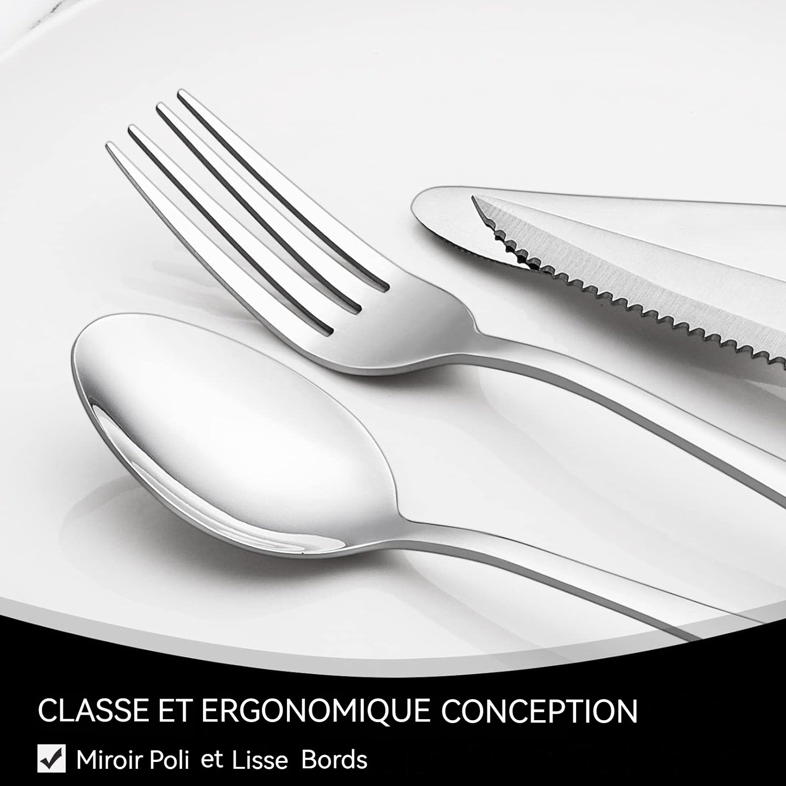 Contenu du set : cuillère à café x4, cuillère à dîner x4, fourchette à salade x4, fourchette à dîner x4, couteau à dîner x4, couteau à steak x4