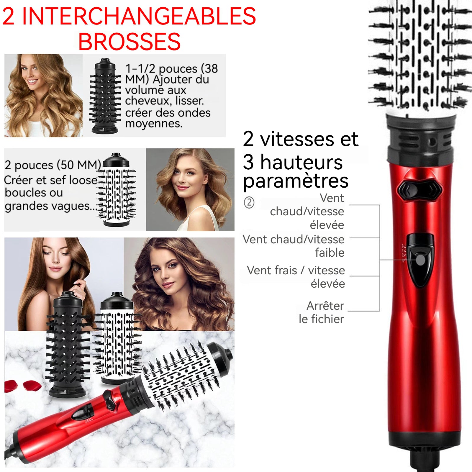 Brosse à cheveux 3 en 1 900-1200w fer à friser automatique multifonctionnel à air froid et à air chaud avec deux têtes de rechange