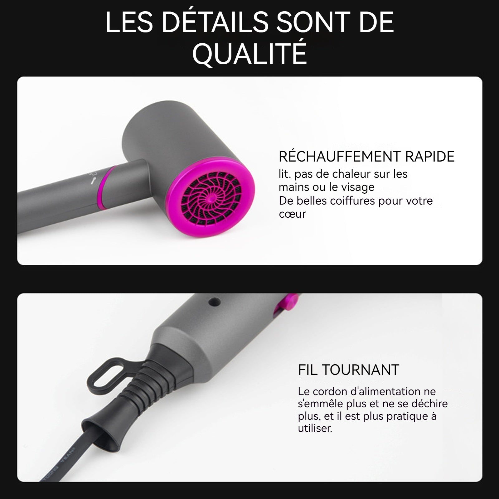 4. Conception silencieuse : Ce sèche-cheveux est doté d'une technologie silencieuse qui réduit le bruit, rendant le processus de séchage plus confortable, notamment pour les utilisateurs sensibles au bruit.