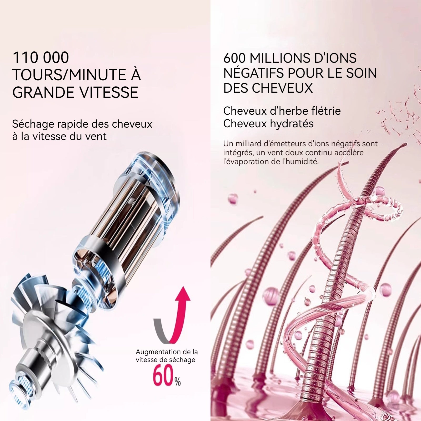 1. Haute efficacité de séchage des cheveux : ce sèche-cheveux est équipé d'un moteur haute vitesse de 110 000 tr/min, qui peut sécher les cheveux rapidement et augmenter la vitesse de soufflage de 60 %.