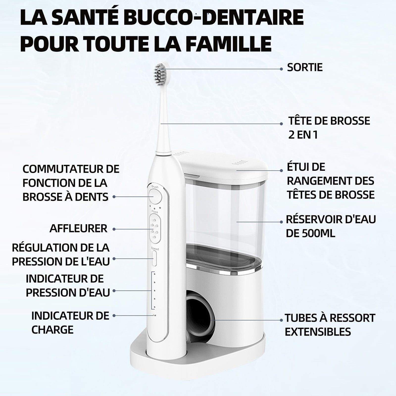 1. 2 en 1 : Ce produit combine une brosse à dents électrique et un fil dentaire à eau, avec un puissant jet pulsé multi-directionnel pour un nettoyage efficace des dents et pour atteindre les zones interstices inaccessibles avec une brosse à dents traditionnelle.