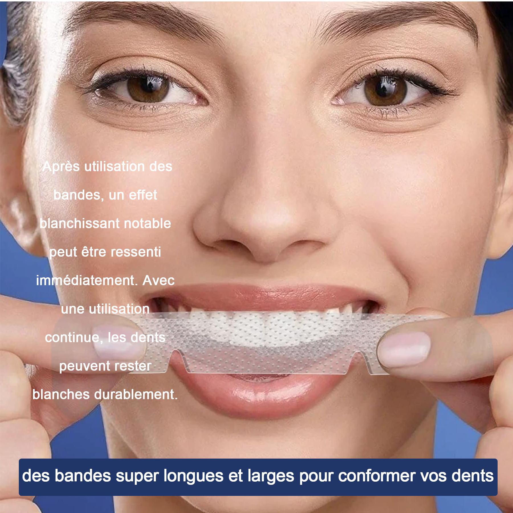 4. Blancheur durable : Après utilisation des bandes, un effet blanchissant notable peut être ressenti immédiatement. Avec une utilisation continue, les dents peuvent rester blanches durablement.
