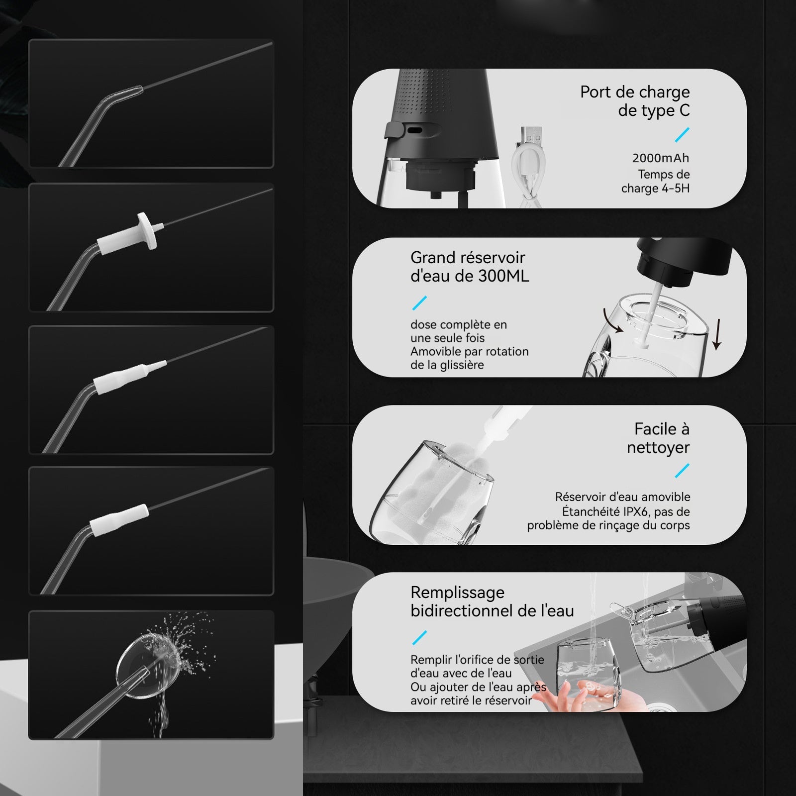 Detartreur dentaire 300 ml capacité du réservoir d'eau de avec 5 buses 3 modes hydropulseur électrique portable rechargeable par USB