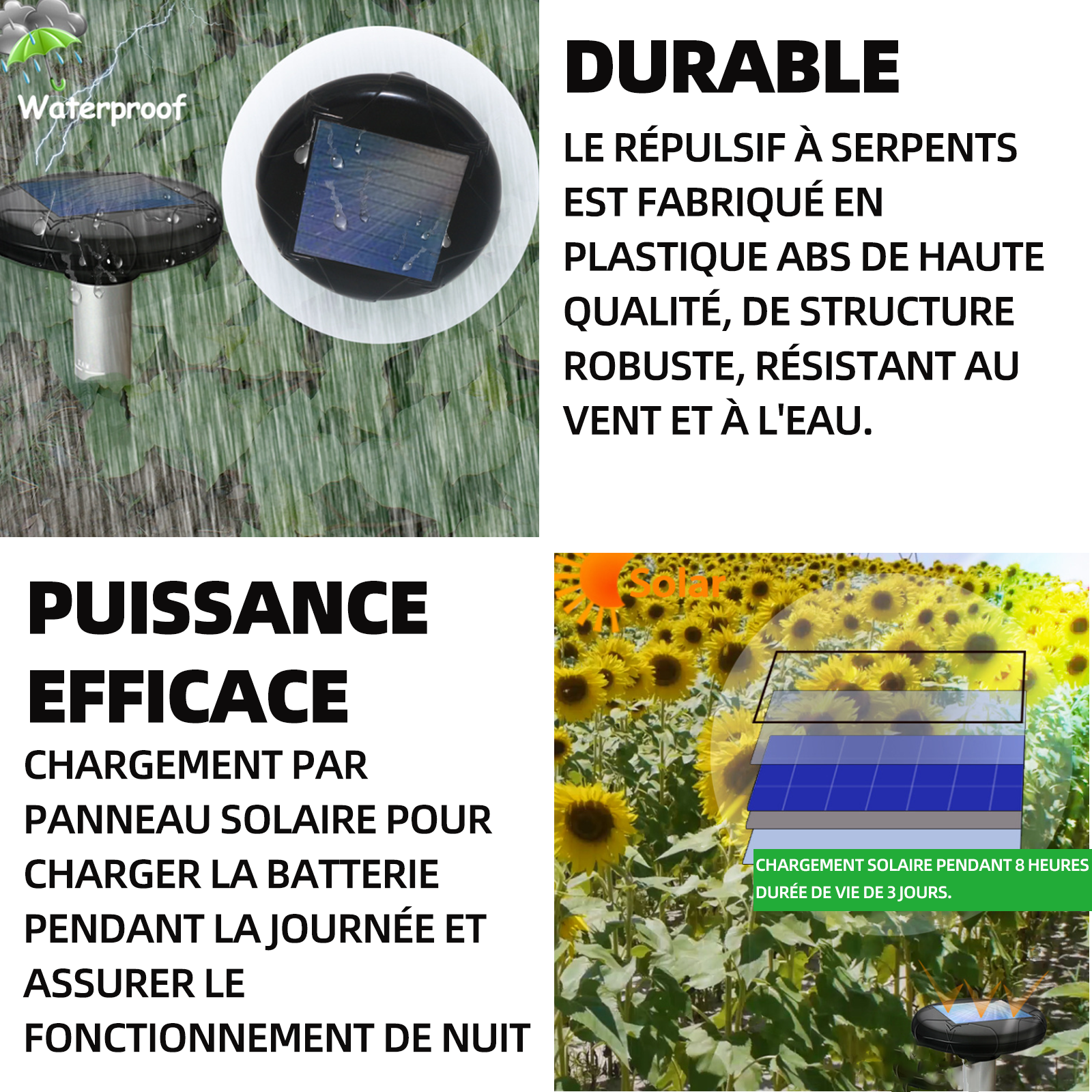 2. Puissance efficace : Ce répulsif pour serpents d'extérieur est alimenté par des panneaux solaires en silicium, se chargeant durant la journée pour fonctionner pendant la nuit.