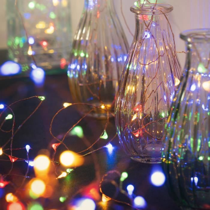 LED 10m - Fil de cuivre avec télécommande 8 modes éclairage réglable - 100 LEDs multicolore intérieur extérieur AMBIANCE : La guirlande lumineuse installe une atmosphère agréable avec ses 100 lumières LED couleur rouge, jaune, verte et bleu. Branchez-la dans votre salon ou chambre ou bien décorez une table, un mur ou vos rideaux avec !