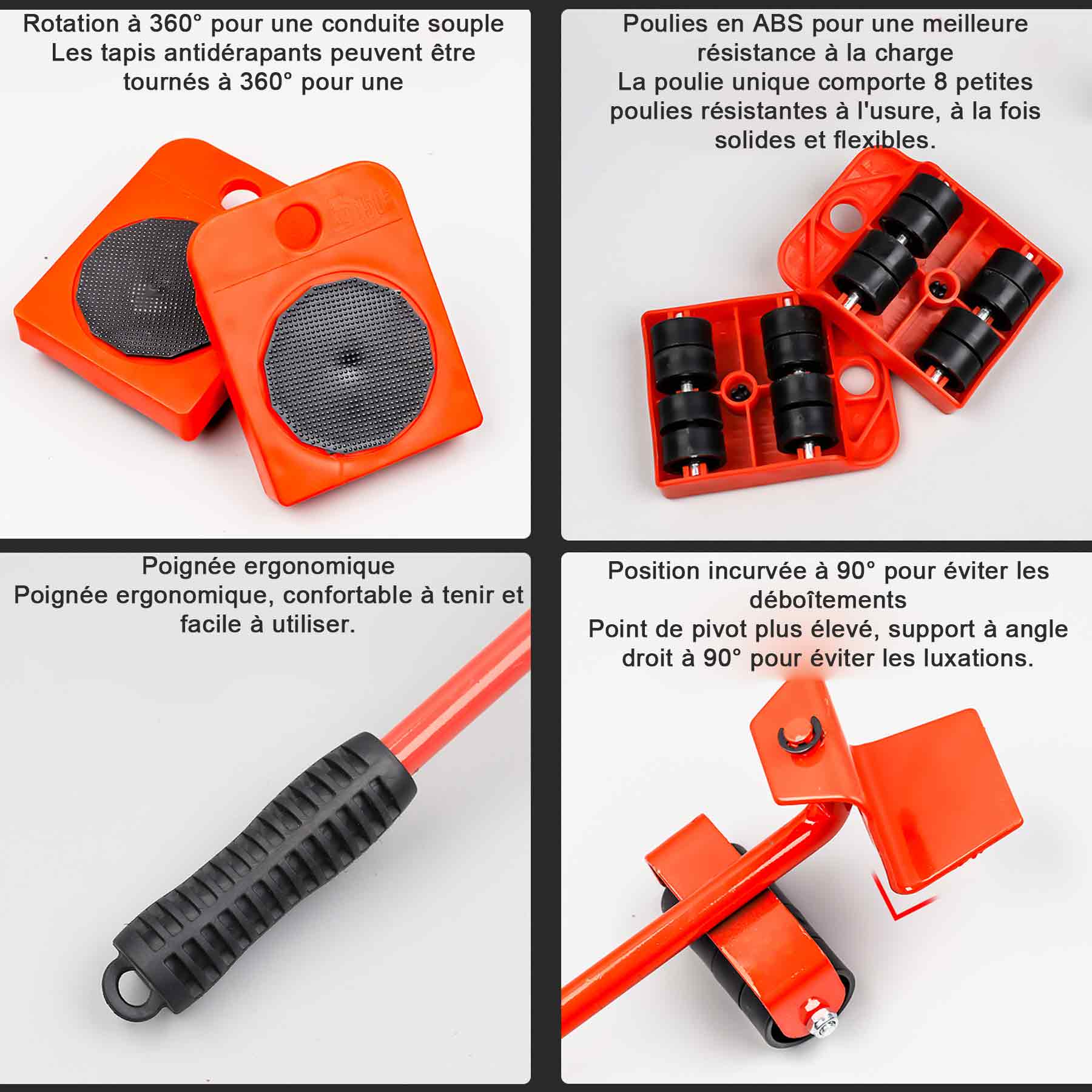 4. Kit de levage : Ce kit comprend un levier et 4 patins à roulettes, utilisant le principe du levier, vous permettant de déplacer facilement de gros objets lourds tout seul.