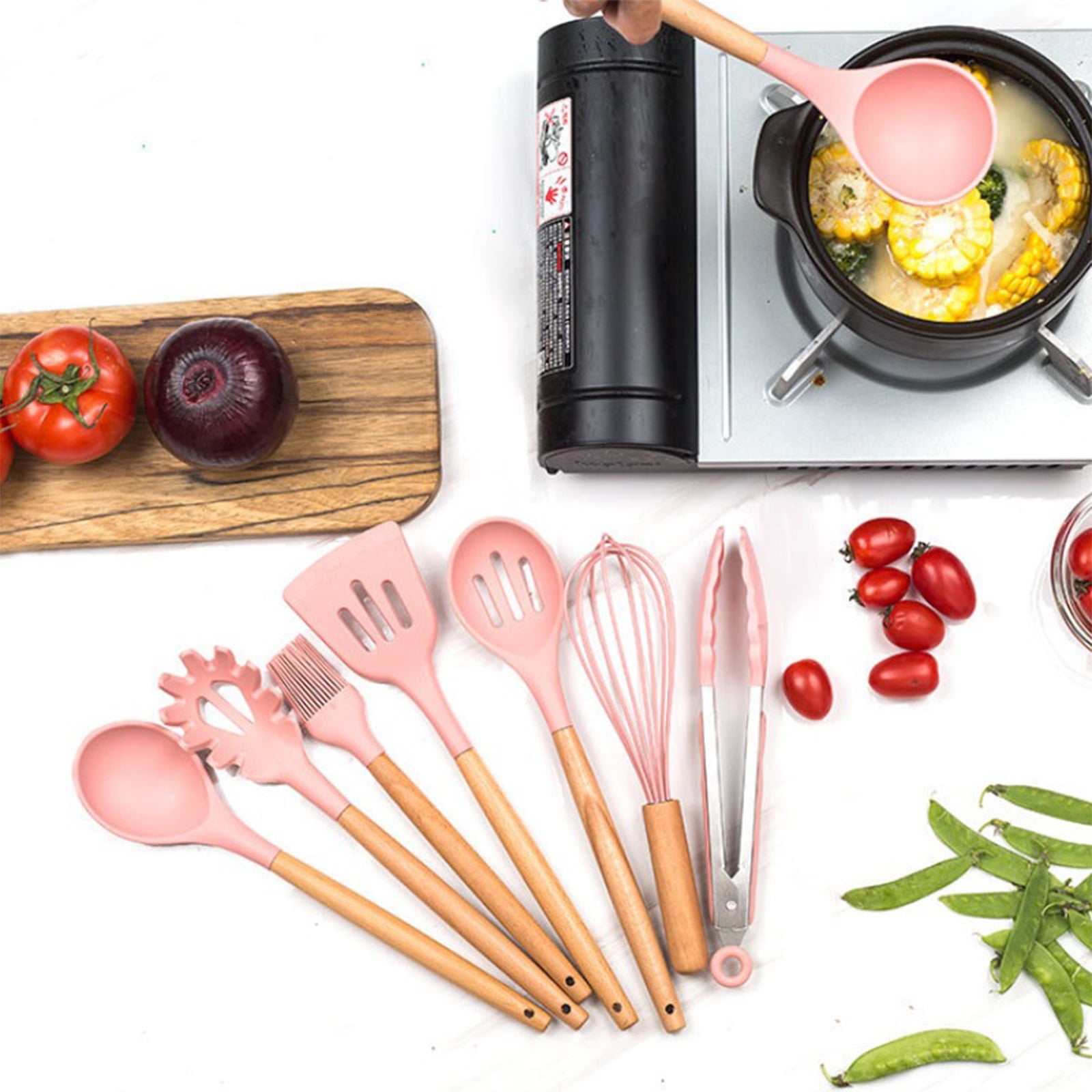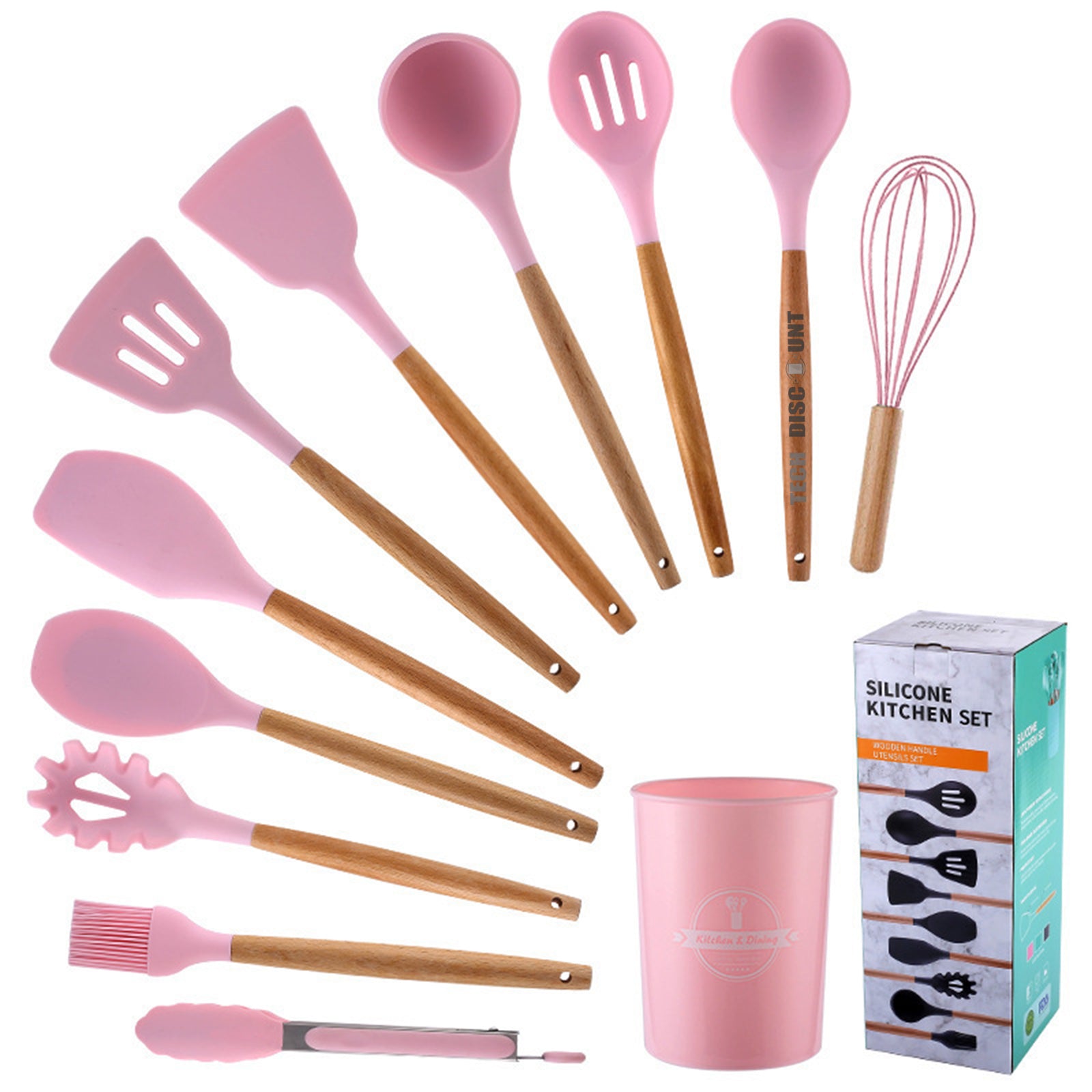TD® Lot Ustensiles,Ensemble d'ustensiles de cuisine en Silicone et en bois antiadhésifs, outil de cuisine- Type 11pcs with bucket #C