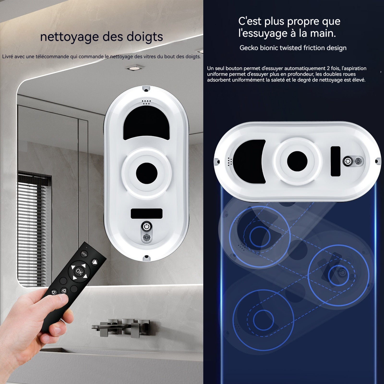 2. Contrôle à distance : Le robot de nettoyage est équipé d'une télécommande, permettant à l'utilisateur de contrôler le robot de nettoyage de fenêtres à distance, facilitant ainsi son utilisation.