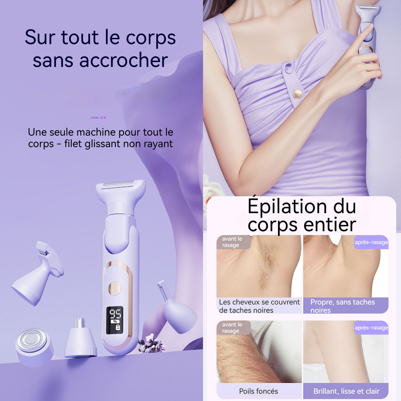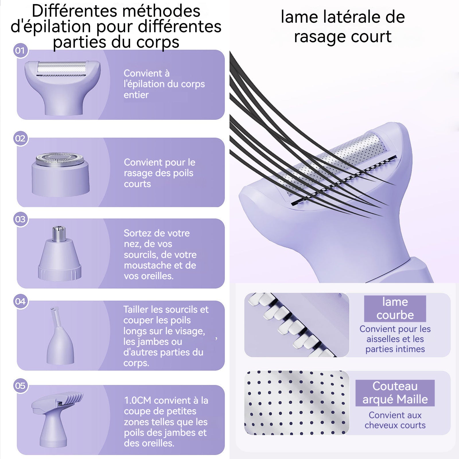 1. Multifonction : Cet épilateur adopte un design cinq en un, intégrant plusieurs fonctions telles que le rasage et l'ébavurage, avec cinq têtes interchangeables pour une expérience d'épilation adaptée à tout le corps.