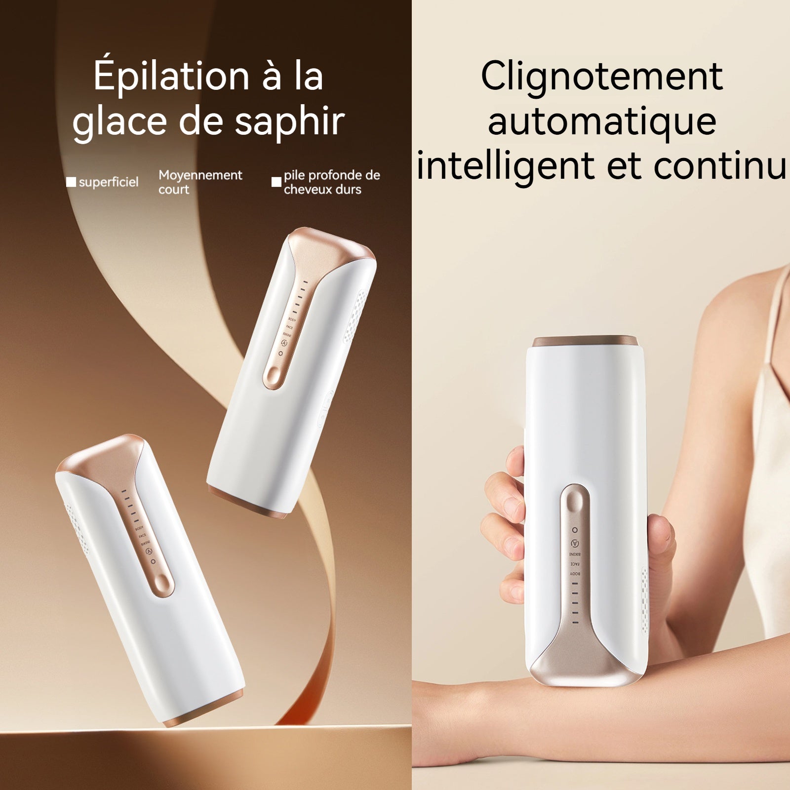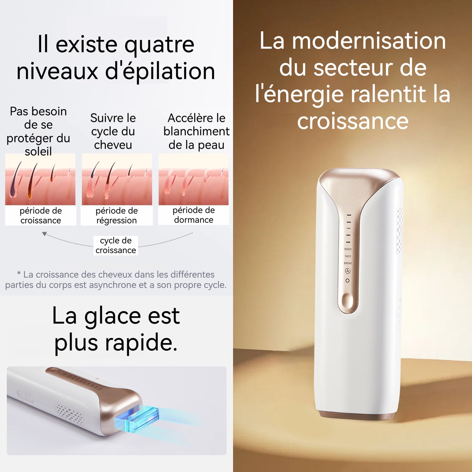 4. Durée de vie ultra longue : Cet épilateur supporte jusqu'à 990 000 flashs, couvrant un large éventail de besoins en épilation, durable et adapté à une utilisation à long terme.
