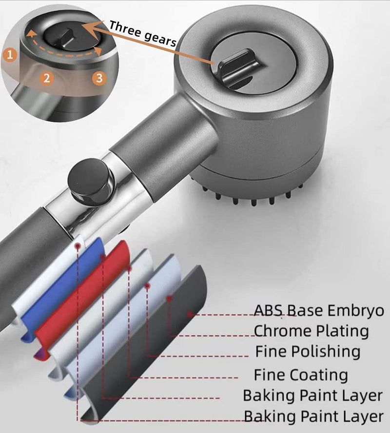 2:[Gris pistolet à texture améliorée] Grâce au processus de peinture multicouche, cette pomme de douche est lisse et résistante à l'usure.