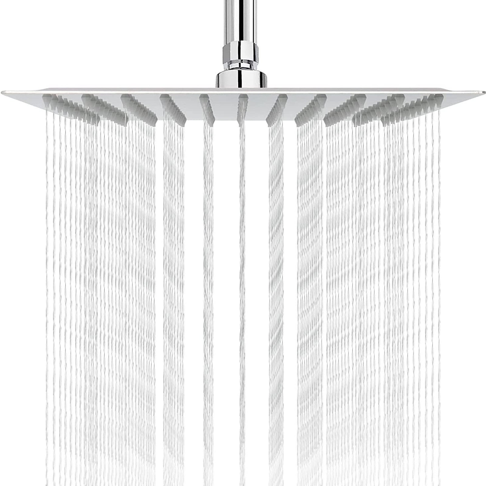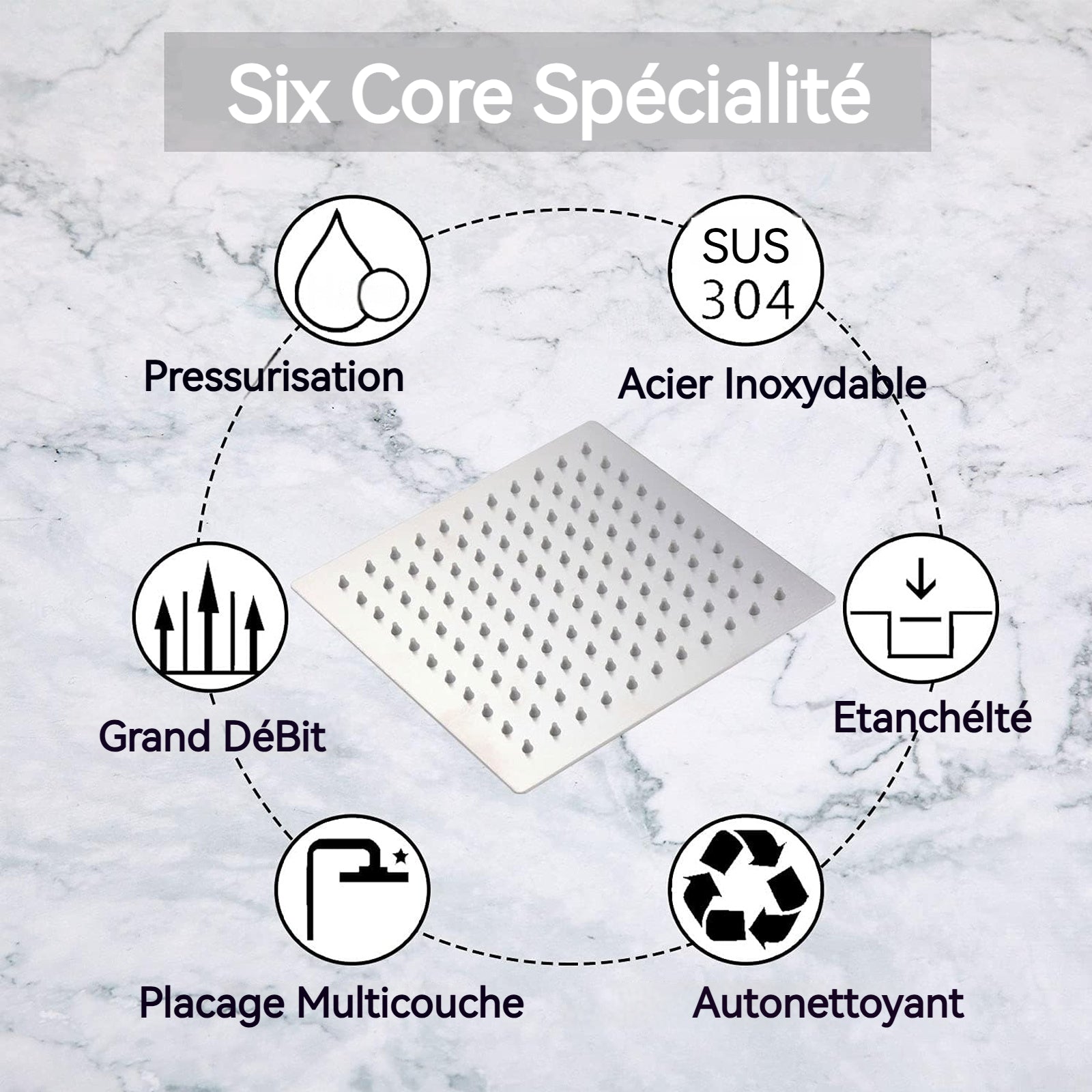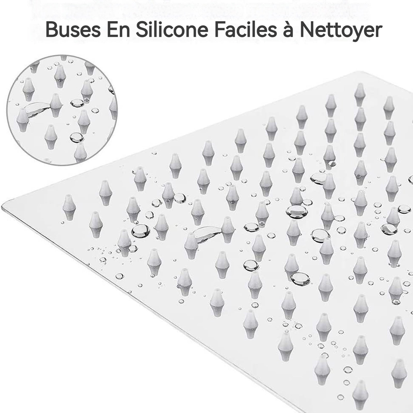 4. Design carré plaqué de 12 pouces : douchette carrée de 30 cm avec des trous de sortie d'eau denses, offrant une expérience de pluie douce et uniforme avec une large couverture.