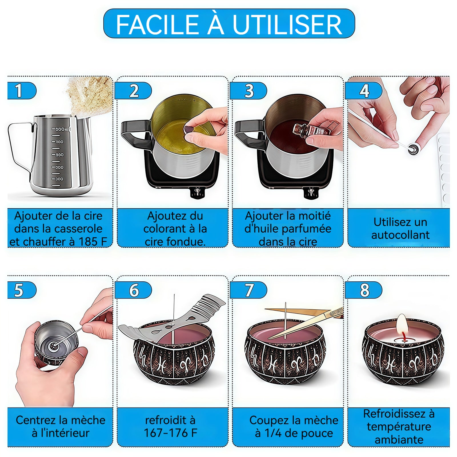 2, Manipulation facile: Le kit DIY inclut des instructions détaillées permettant de réaliser facilement des bougies, du chauffage de la cire à l'ajout des parfums jusqu'au refroidissement.