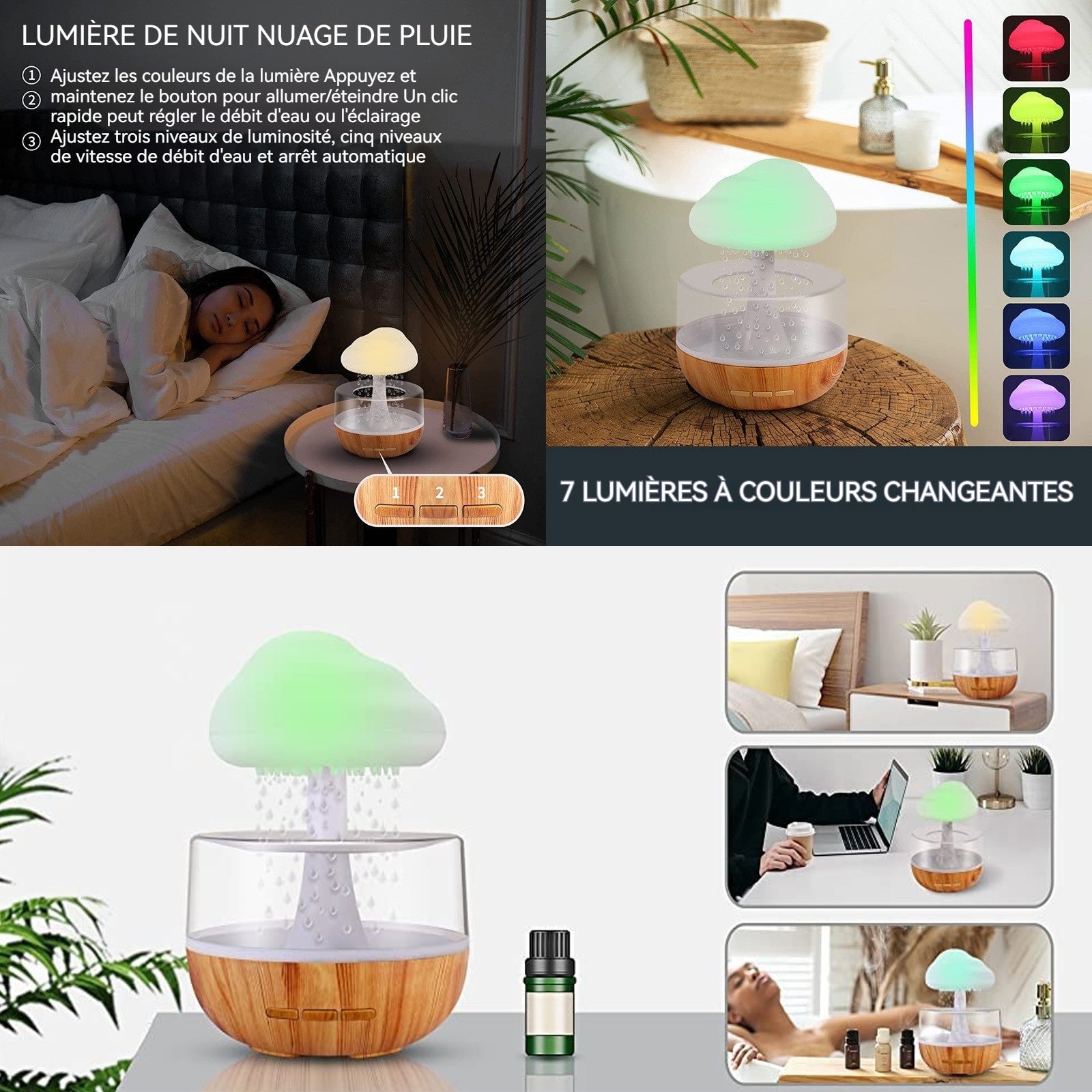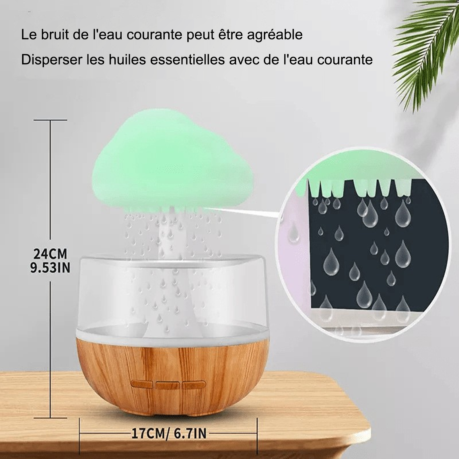Humidificateur d'air 300ml nuages de pluie diffuseur d'huiles essentielles en bois avec gouttes d'eau 7 lumières LED de couleur
