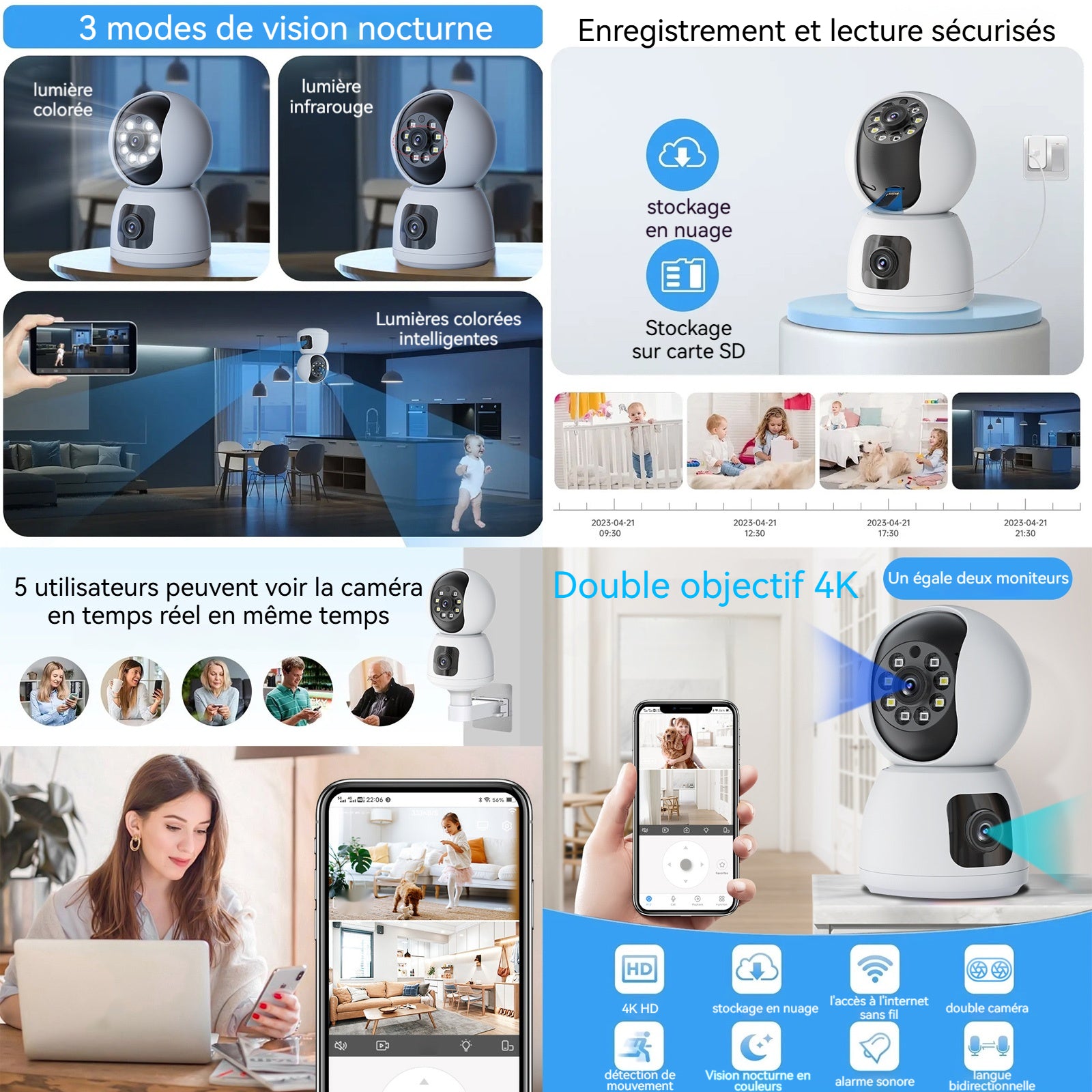 Camera surveillance wifi intérieure 1080p 2,4G wifi PTZ 4mp double objectif 3 modes de vision nocturne IR caméra de surveillance