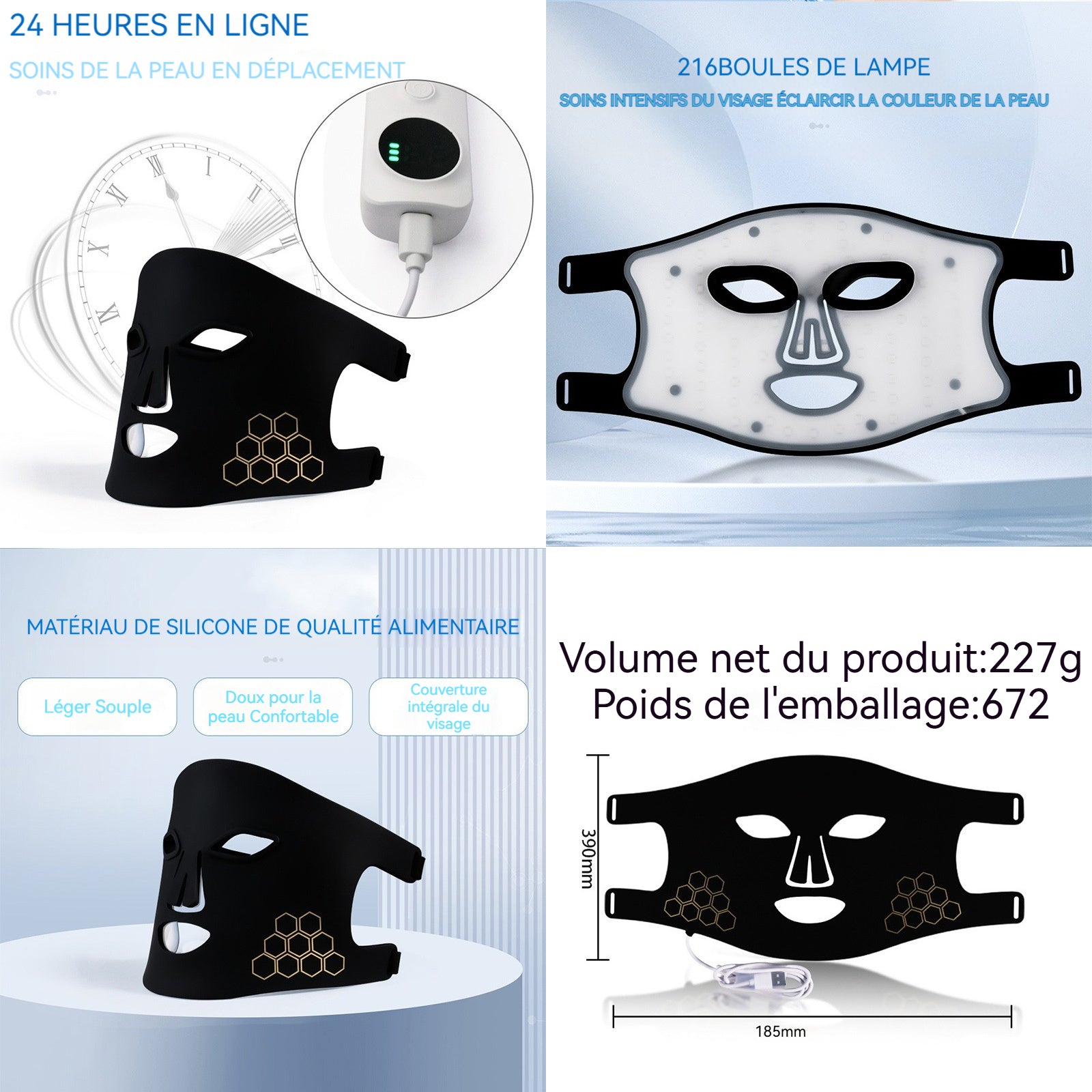 Masque LED en silicone 4 couleurs avec 216 lumières masque de luminothérapie multifonctionnel masque LED visage luminothérapie