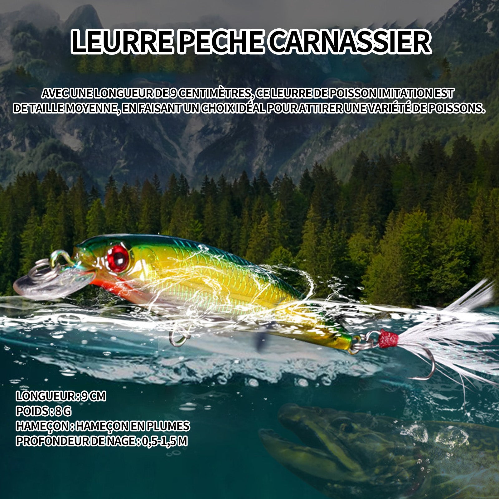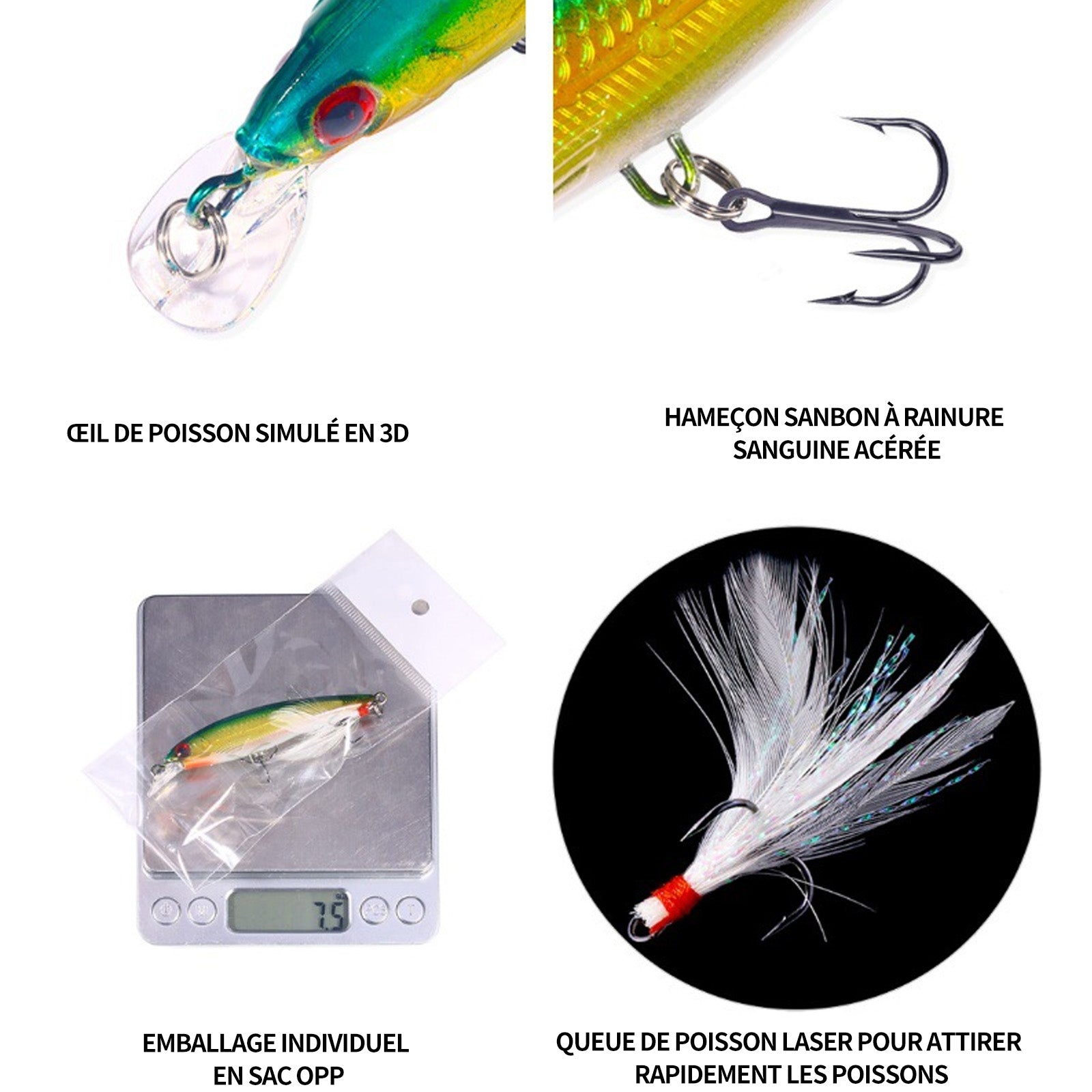4. Apparence réaliste : La conception de ce leurre de poisson imitation imite l'apparence des poissons réels, produisant des réflexions et des mouvements réalistes dans l'eau, augmentant ainsi son efficacité pour attirer les poissons.