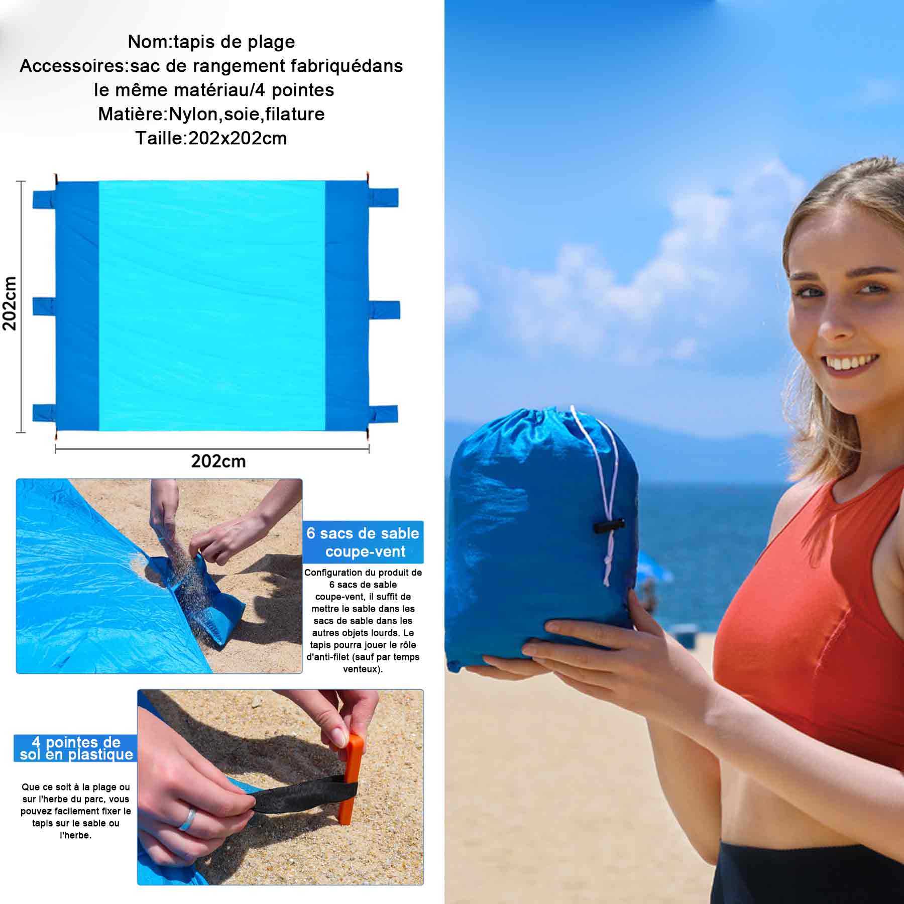 Couverture de plage anti sable tapis imperméable 202 x 202 cm 6 sacs de sable coupe-vent Filage de fils de nylon Tapis de plage