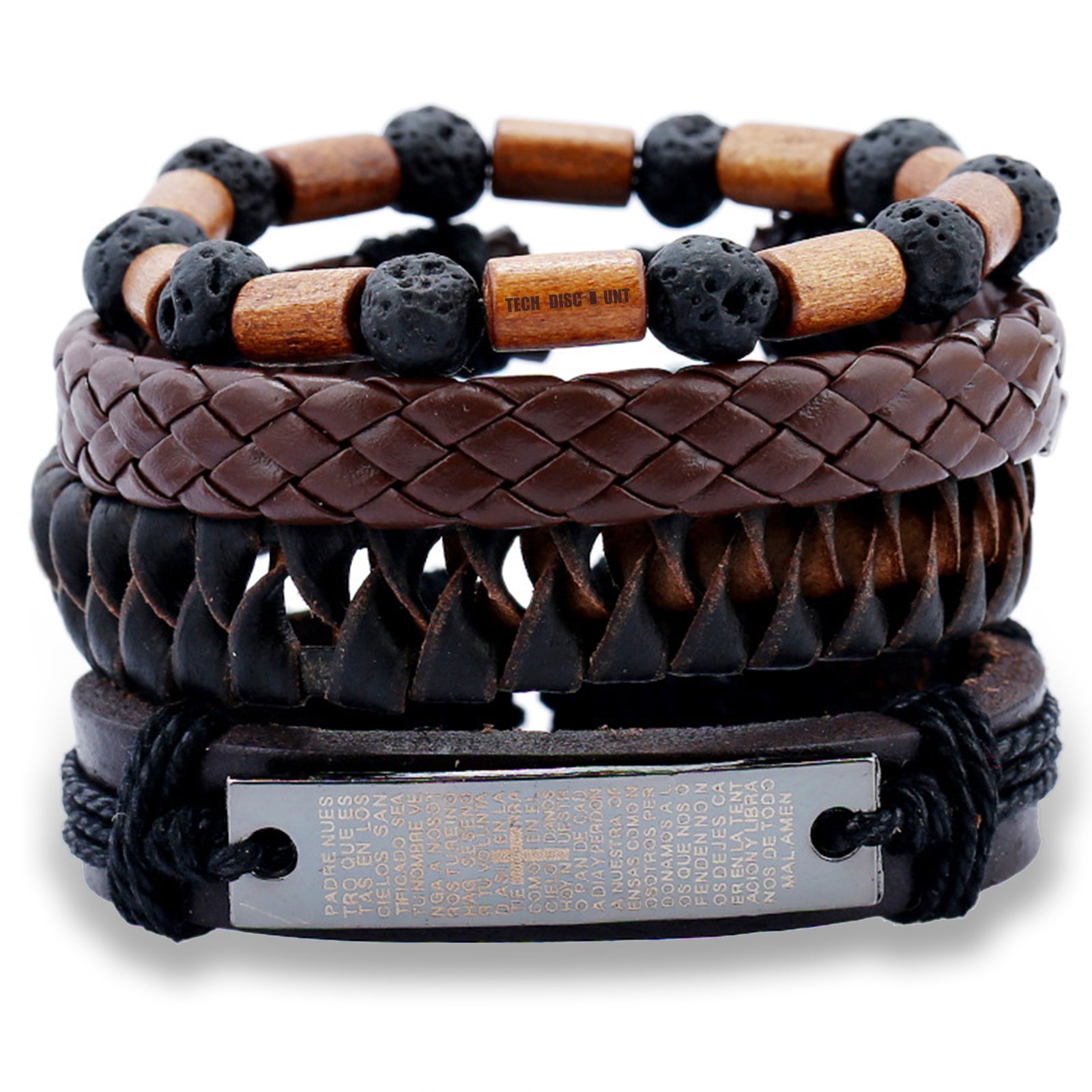 TD® Ensemble en cuir Bracelet pour homme Pierre volcanique Perles en bois Bracelet en cuir tressé rétro Ensemble de 4 pièces