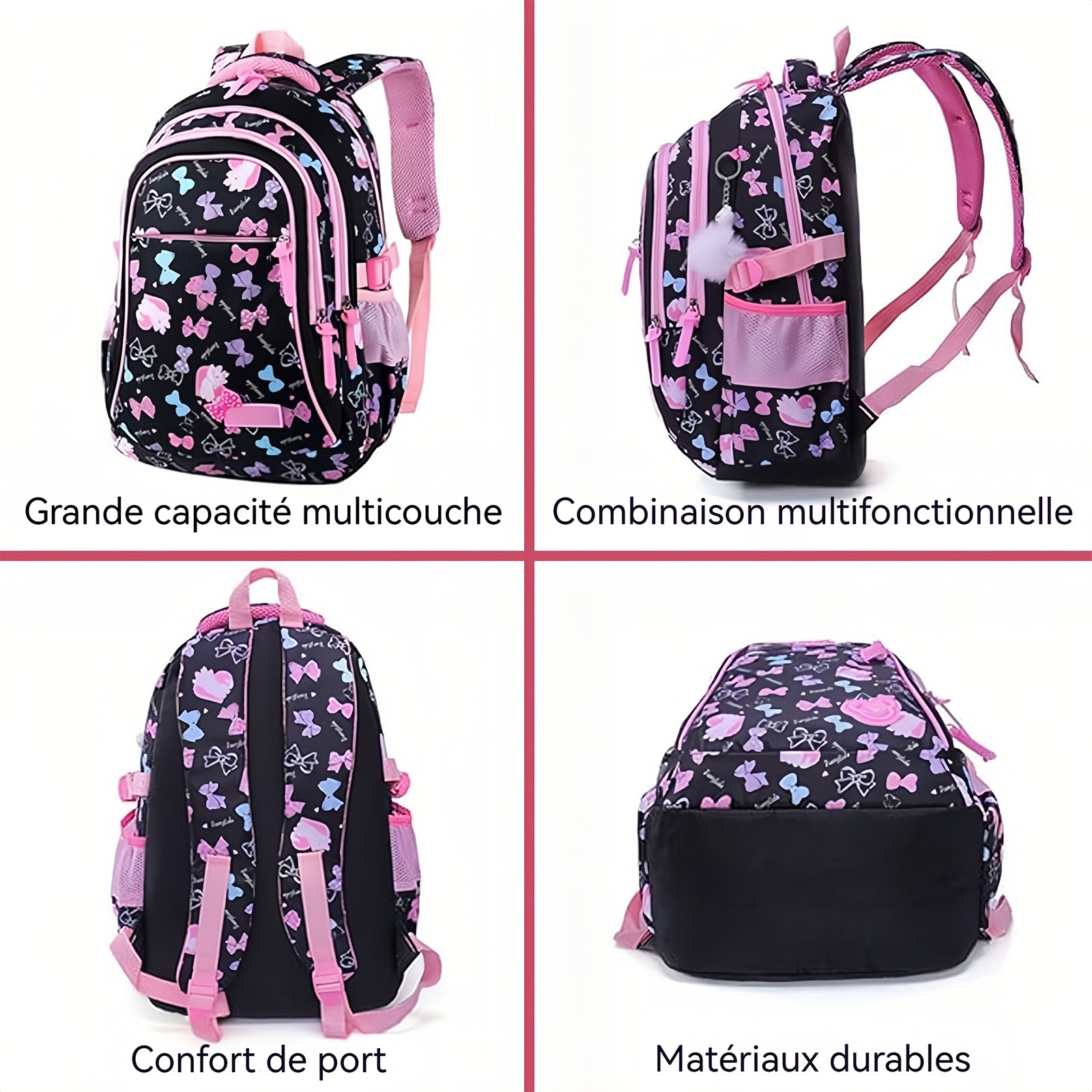 1. Combinaison multifonctionnelle : Ce produit comprend un ensemble de 3 pièces (sac à dos + sac à main + trousse) pour répondre aux divers besoins de rangement, avec un design à plusieurs compartiments pour classer les objets de manière scientifique, facilitant ainsi leur accès.