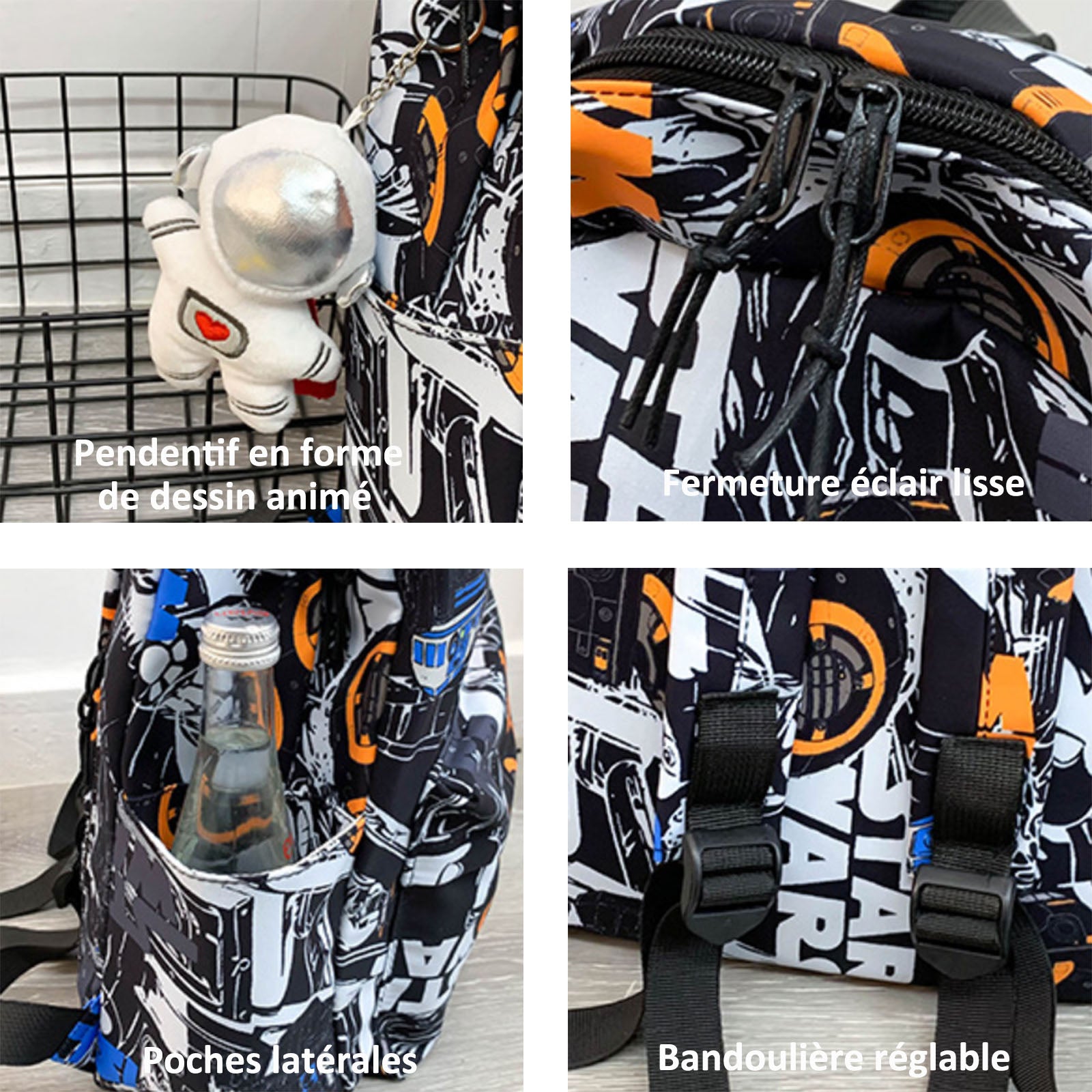 2.Design tendance:L'avant du sac à dos présente un style de graffiti urbain, se mariant avec différents styles, ce qui le rend parfait pour les photos et le partage sur les réseaux sociaux.