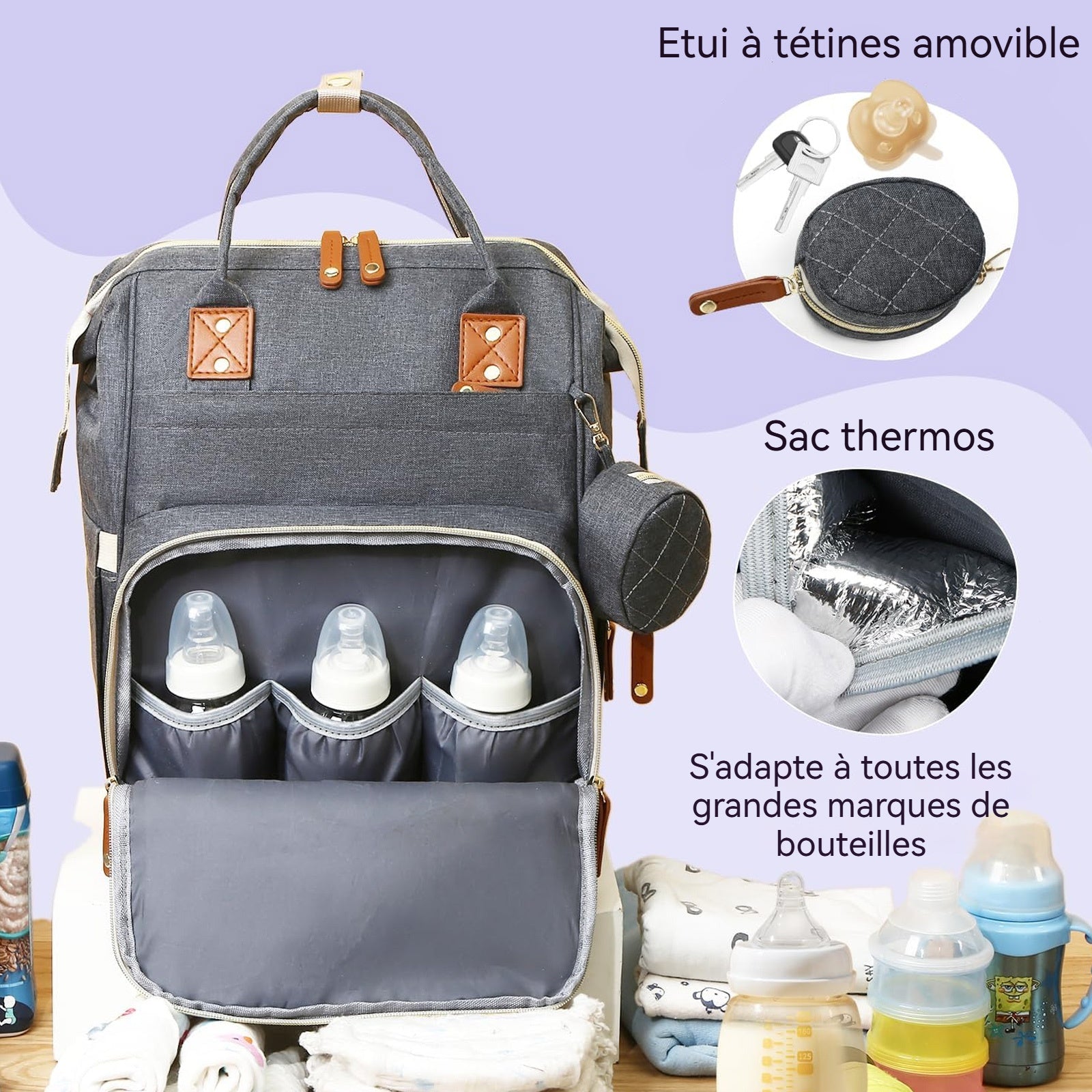 Sac à langer 38x27 cm Tissu Oxford Grande capacité de 20 L Peut contenir 3 biberons Peut se déplier en lit bébé de 70 cm Sac à dos