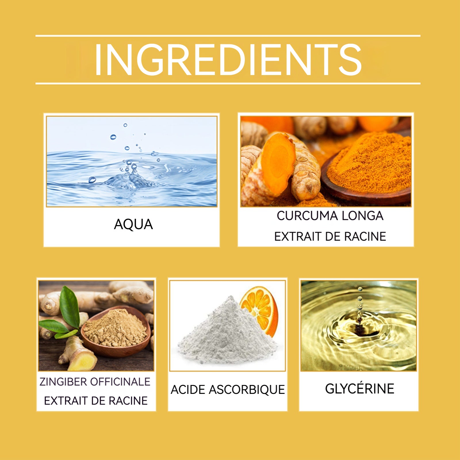 Ingrédients : Eau, extrait de racine de curcuma, extrait de racine de gingembre, glycérol