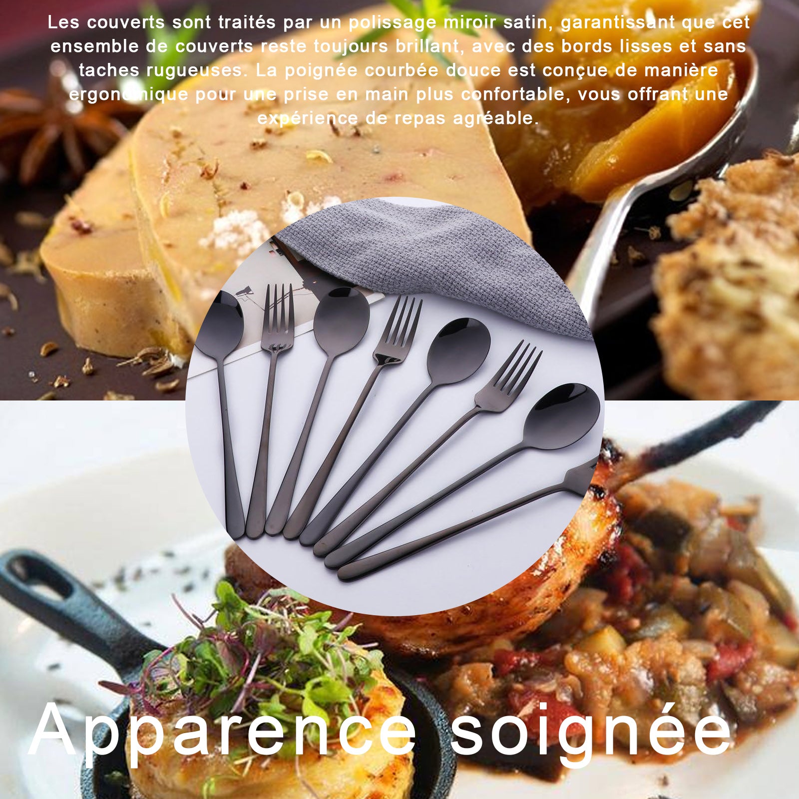 4. Apparence soignée : Les couverts sont traités par un polissage miroir satin, garantissant que cet ensemble de couverts reste toujours brillant, avec des bords lisses et sans taches rugueuses. La poignée courbée douce est conçue de manière ergonomique pour une prise en main plus confortable, vous offrant une expérience de repas agréable.