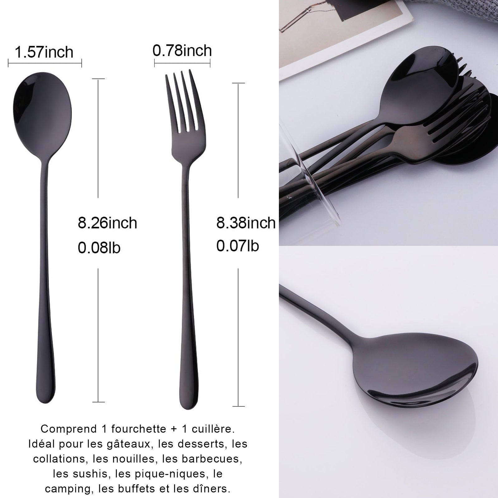 1. Produits : Comprend 1 fourchette + 1 cuillère. Idéal pour les gâteaux, les desserts, les collations, les nouilles, les barbecues, les sushis, les pique-niques, le camping, les buffets et les dîners.