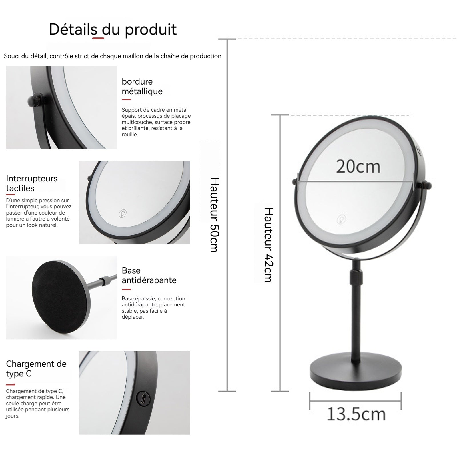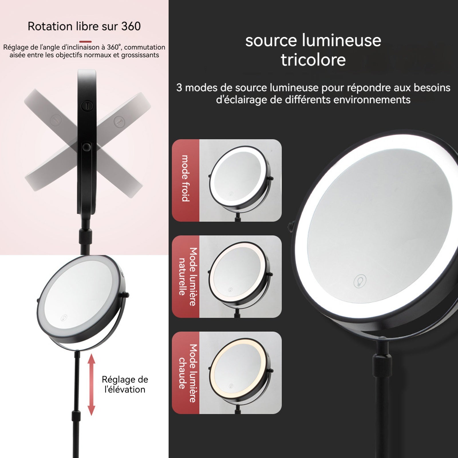 2. Réglage flexible : Ce miroir de maquillage lumineux prend en charge une rotation à 360 degrés et un contrôle tactile pour un réglage en hauteur, ce qui le rend pratique et facilite la recherche du meilleur angle de vue.