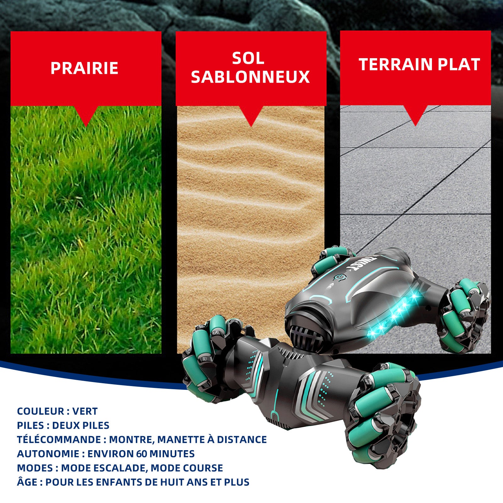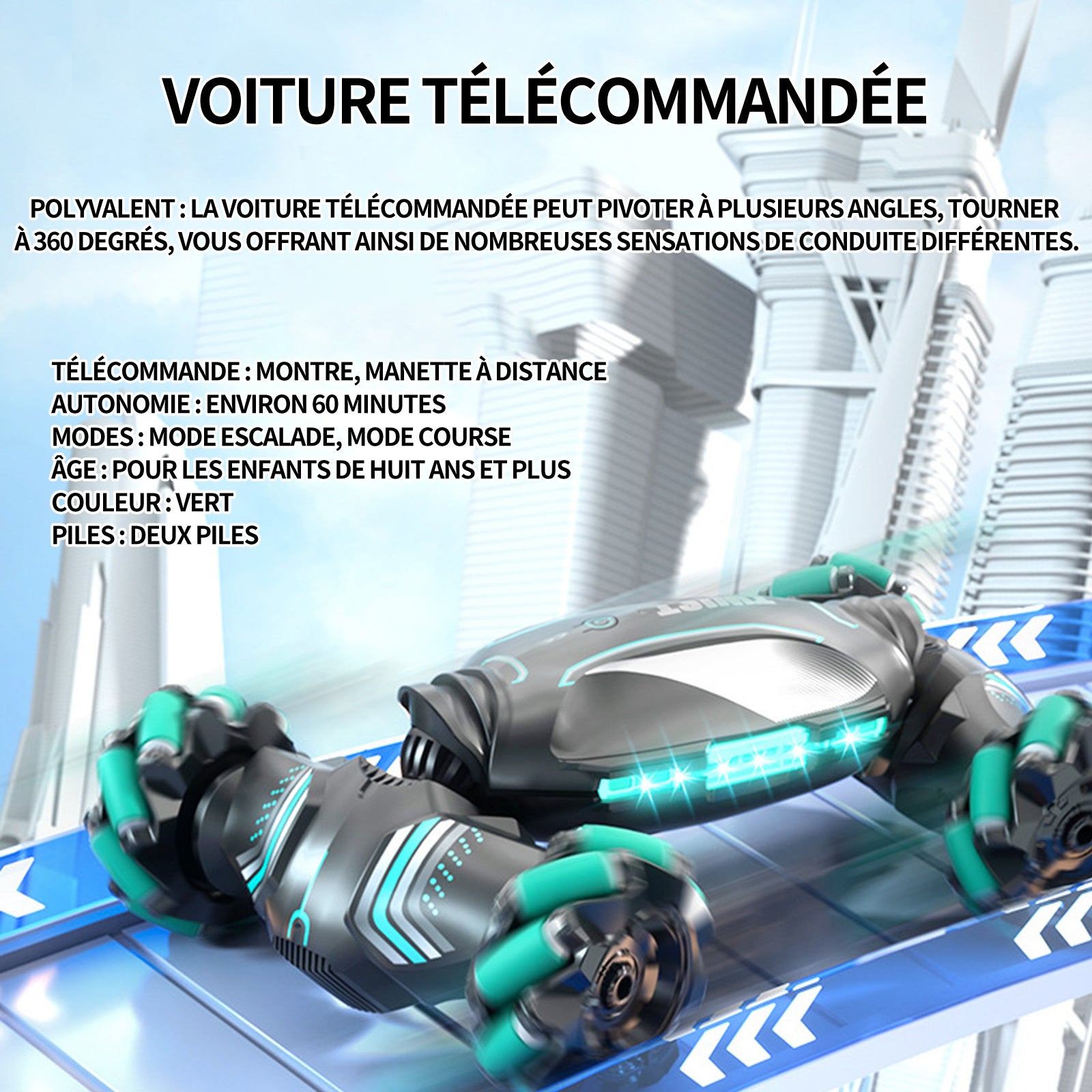 2. Double mode de commutation : Le véhicule jouet dispose d'un mode escalade et d'un mode course, pouvant s'adapter à différents terrains et besoins de vitesse, offrant aux enfants une expérience de jeu plus riche.