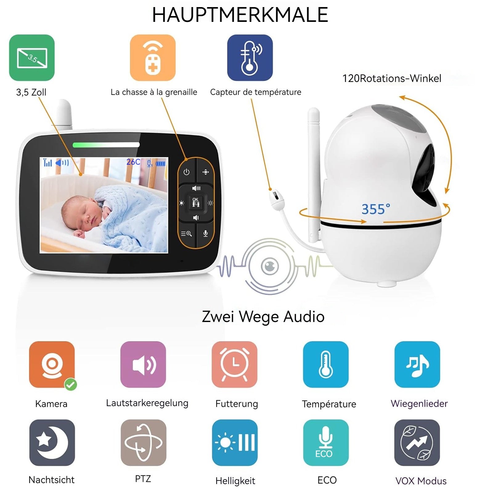 Babyphone Écran de 3,5 pouces Caméra avec fonction secouant la tête Interphone vocal avec vision nocturne Moniteur vidéo pour bébé