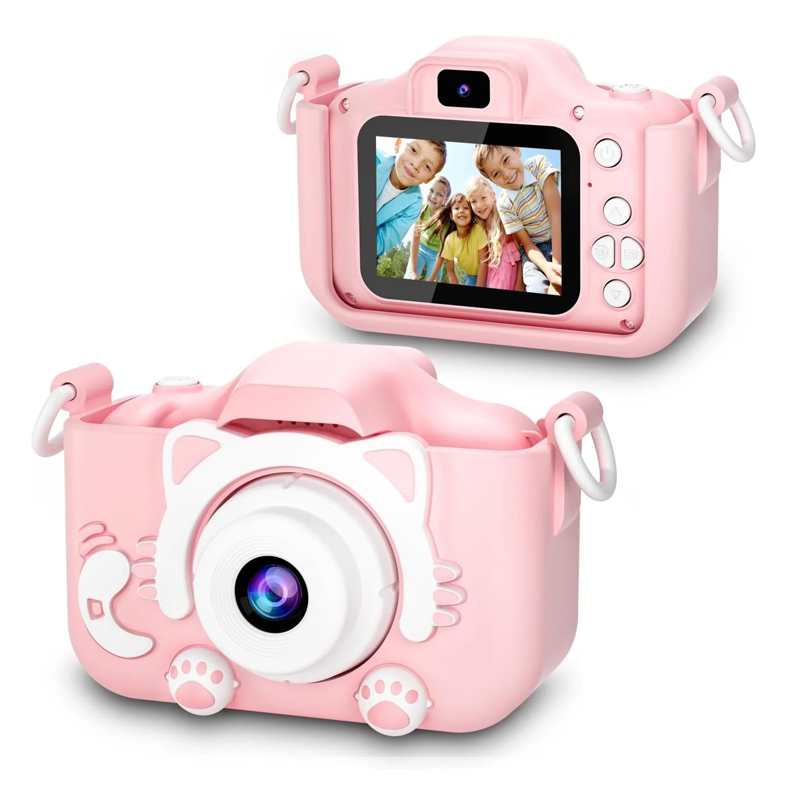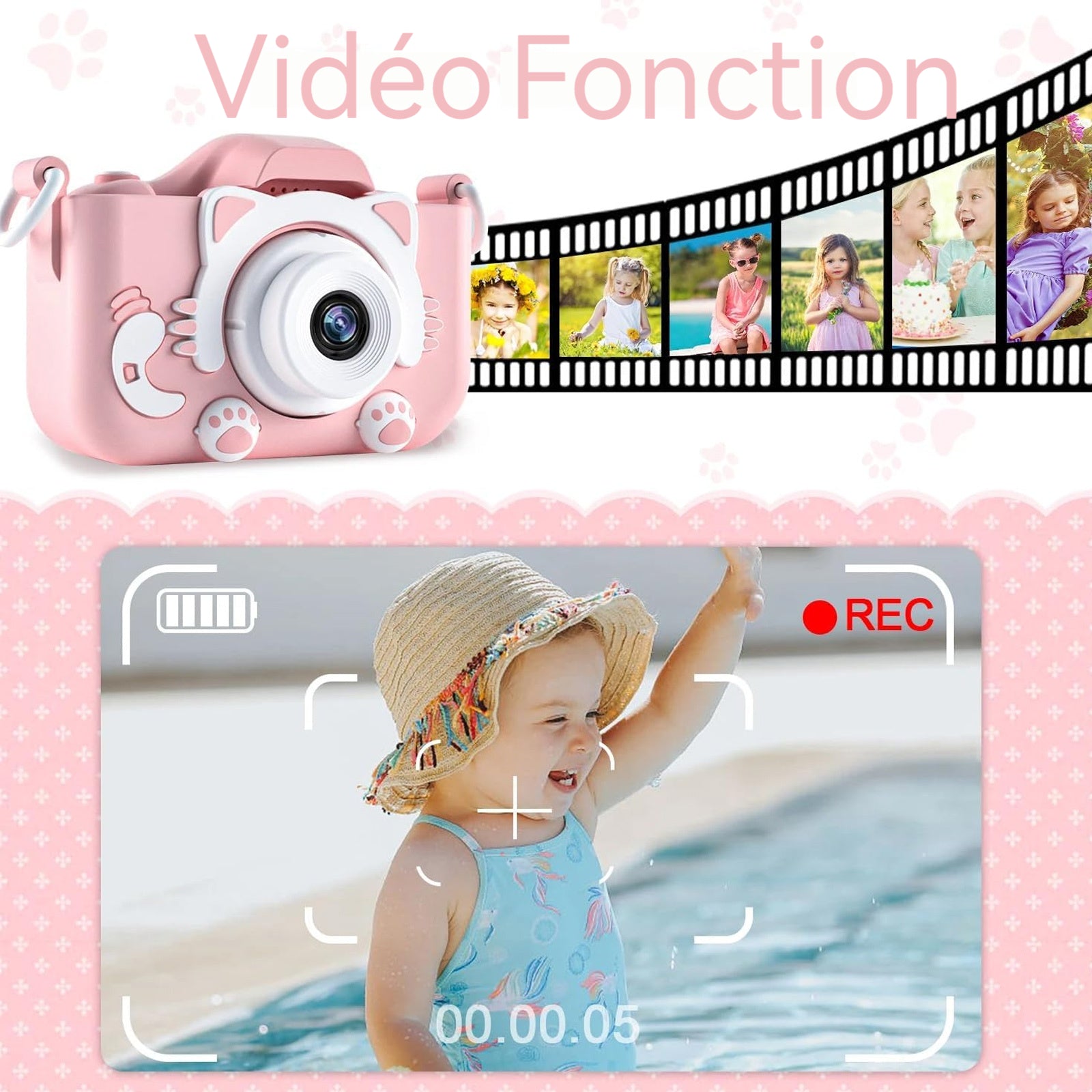 3. Conception adaptée aux enfants : La caméra présente un design rose + matériau ABS, avec un étui de protection en silicone, des dimensions compactes de 83x61x48 mm et un poids léger de 0,14 kg, facilitant sa prise en main et son utilisation par les enfants.