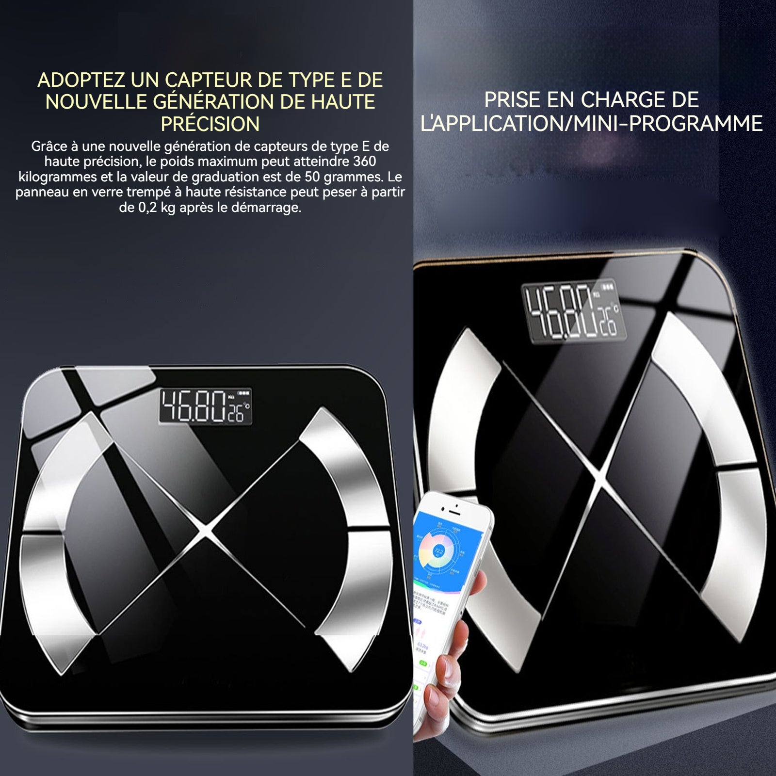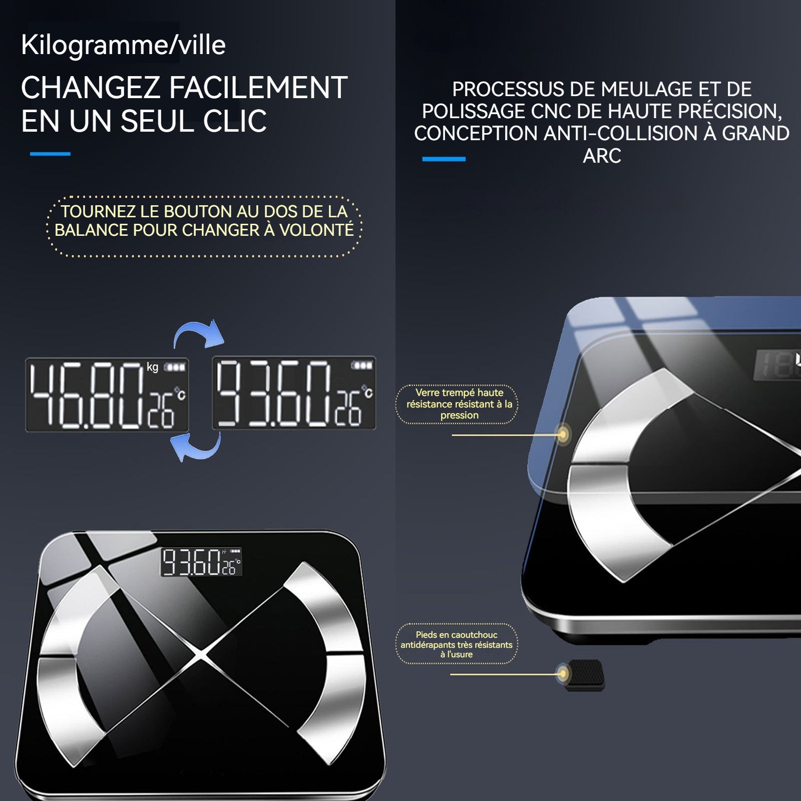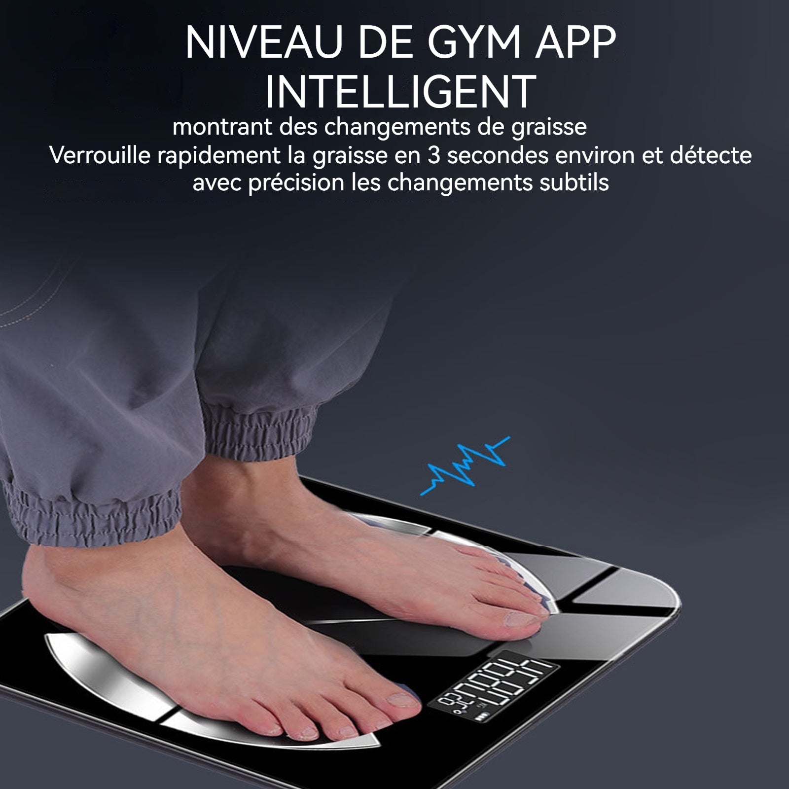 Balance avec 26 éléments de surveillance santé prise en charge de l'utilisation de l'application balance bluetooth rechargeable